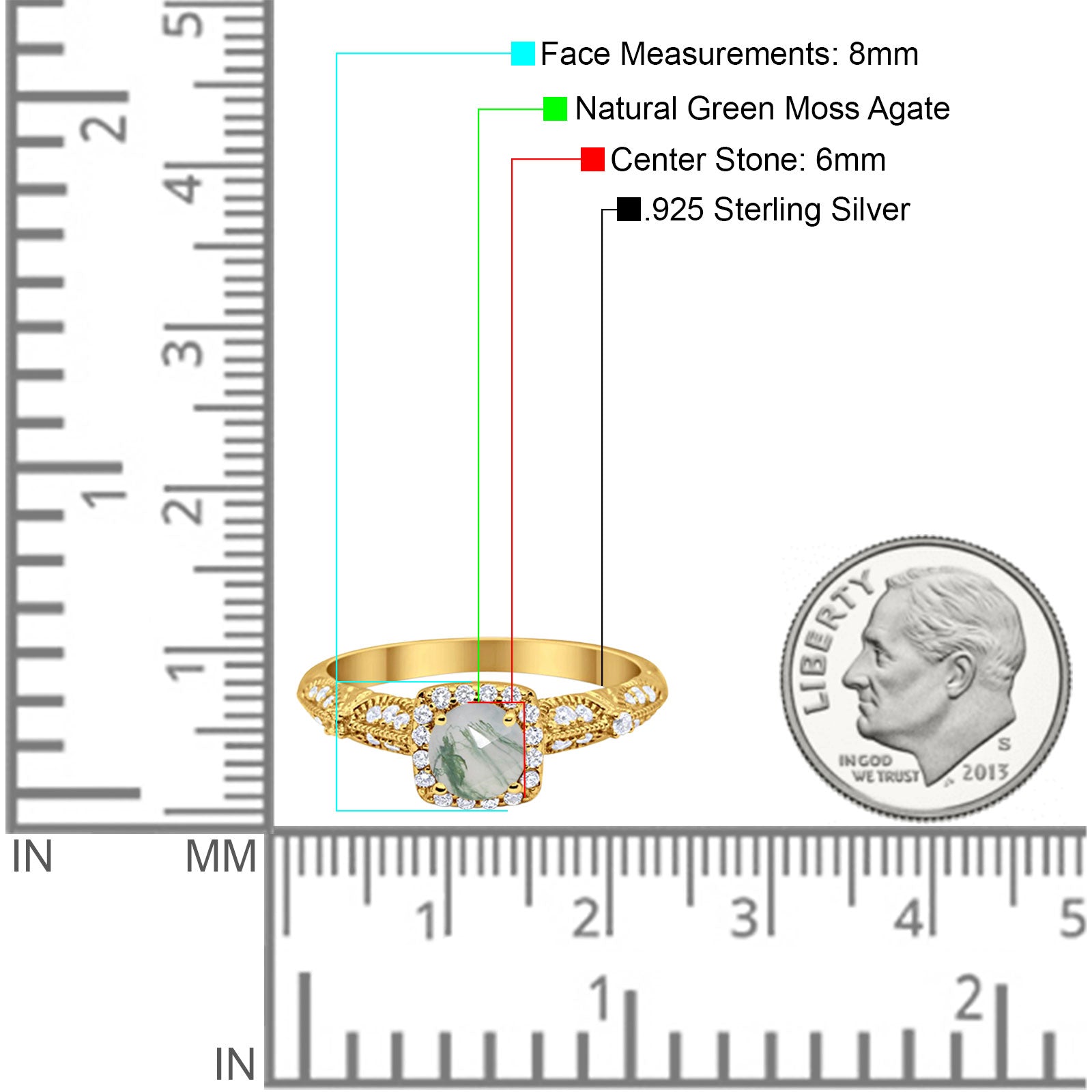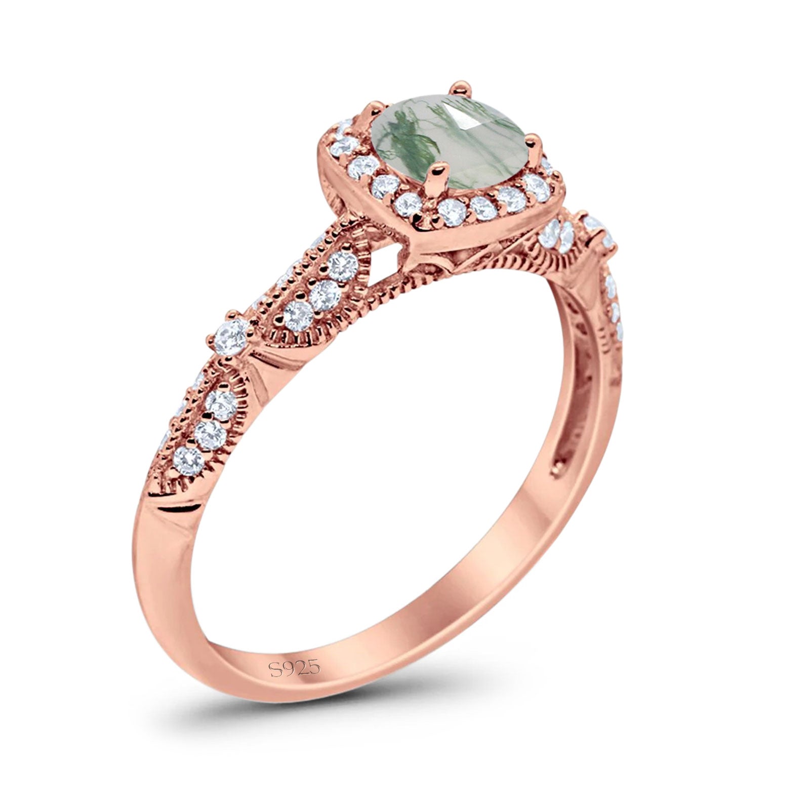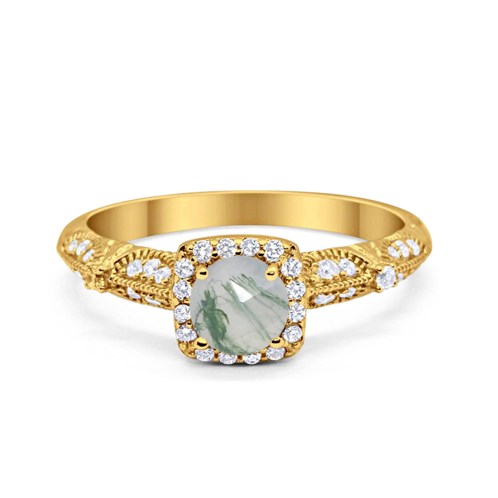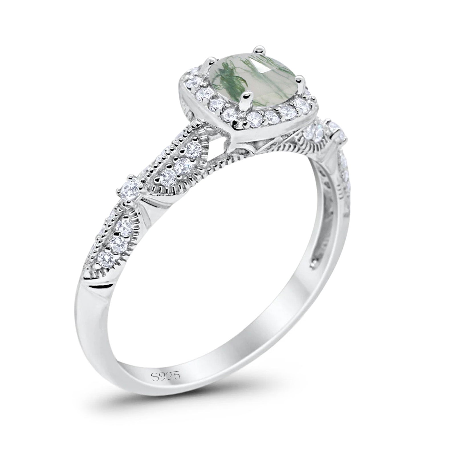 Vintage Round Natural Green Moss Agate Halo Beaded Ring 925 Sterling Silver