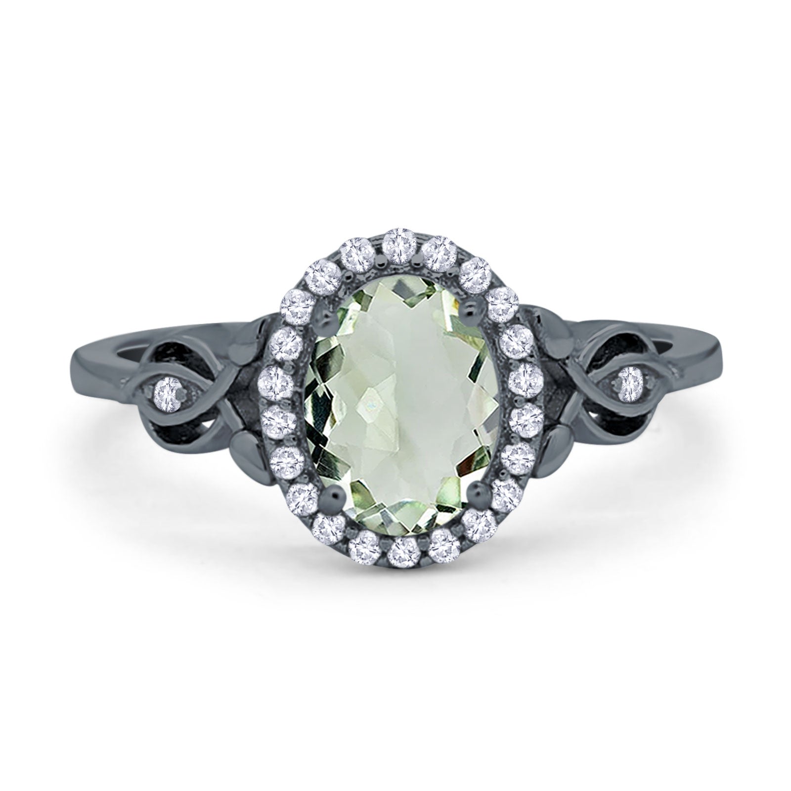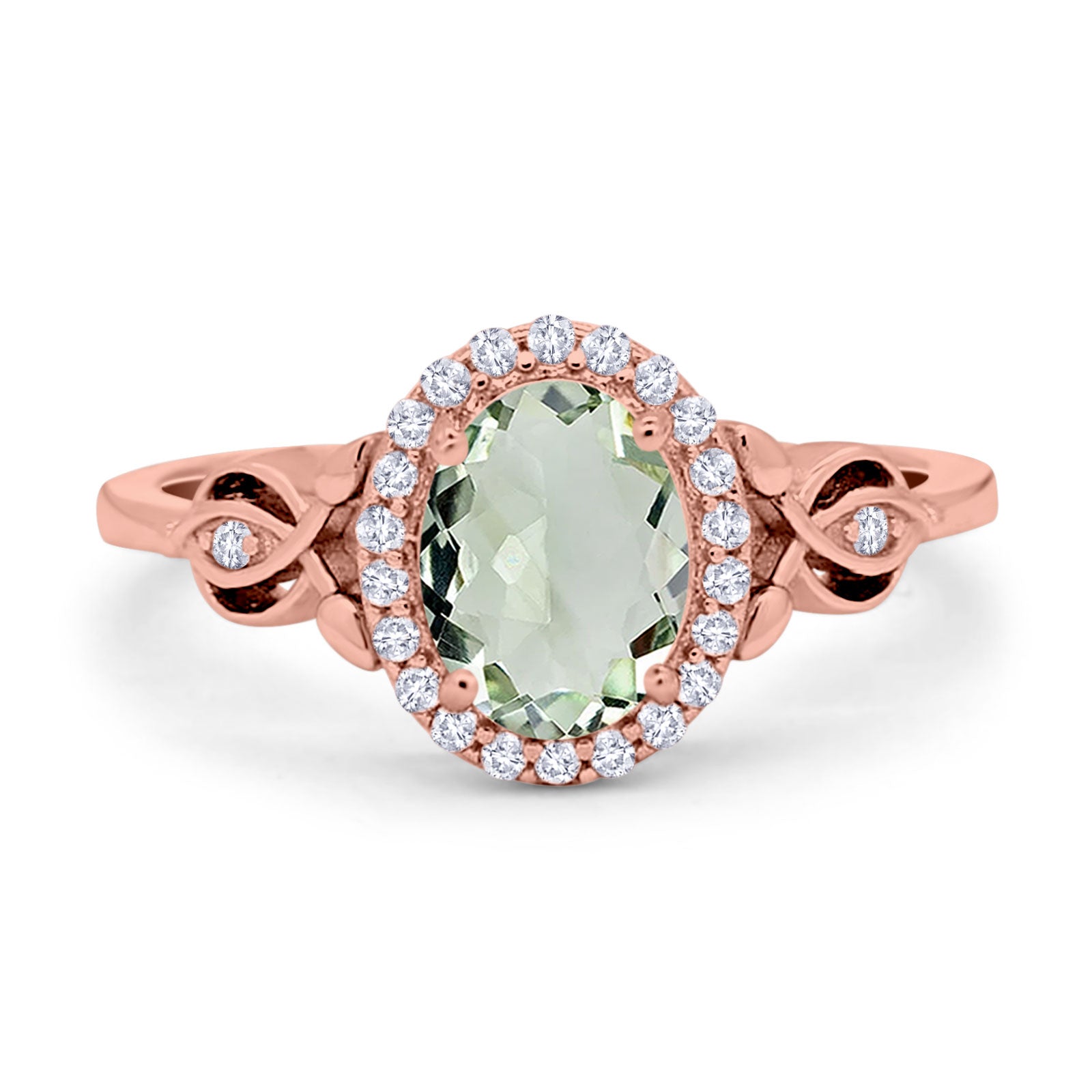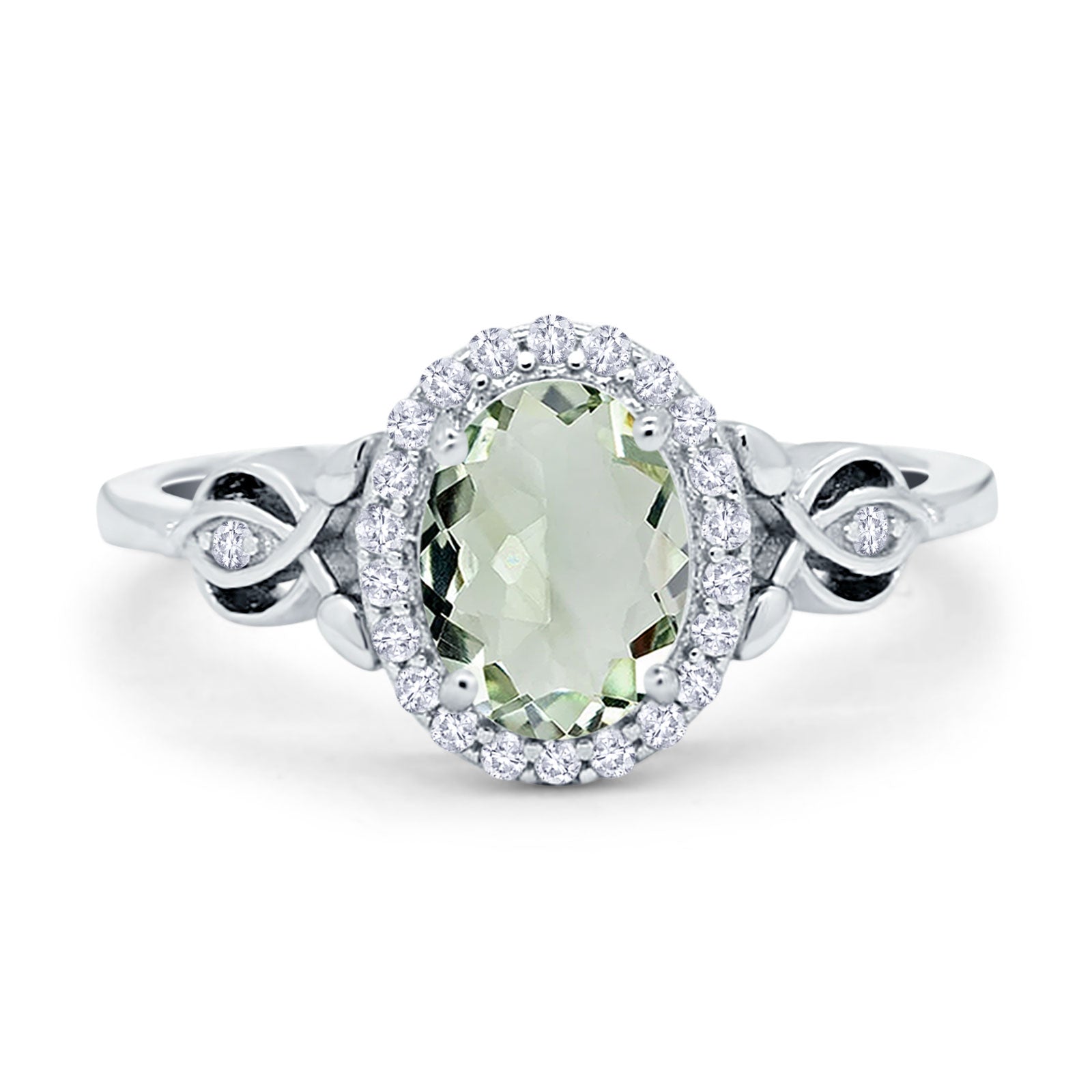 Vintage Style Oval Natural Green Amethyst Prasiolite Halo CZ Split Shank Twisted 925 Sterling Silver