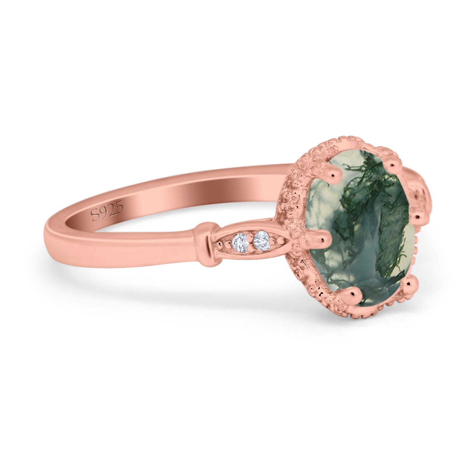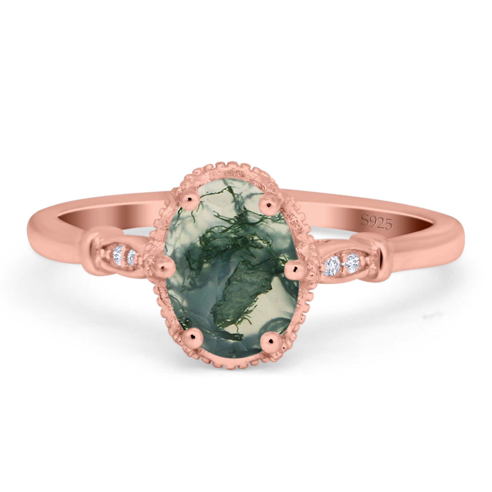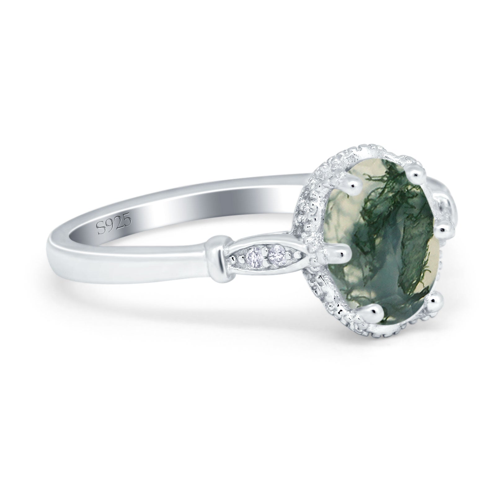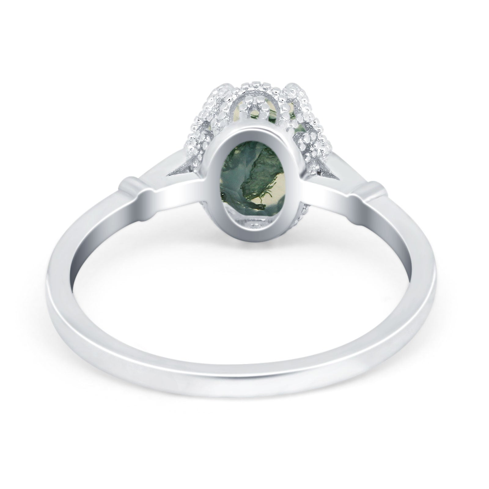Vintage Style Oval Natural Green Moss Agate Beaded Ring 925 Sterling Silver