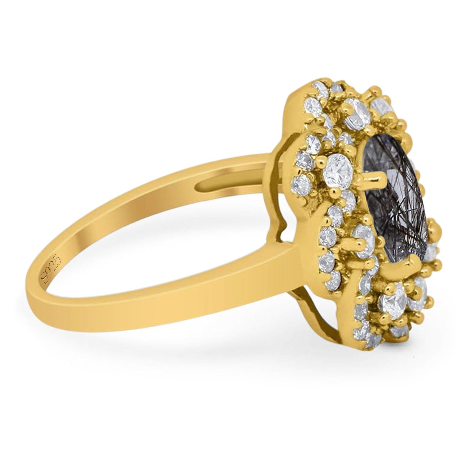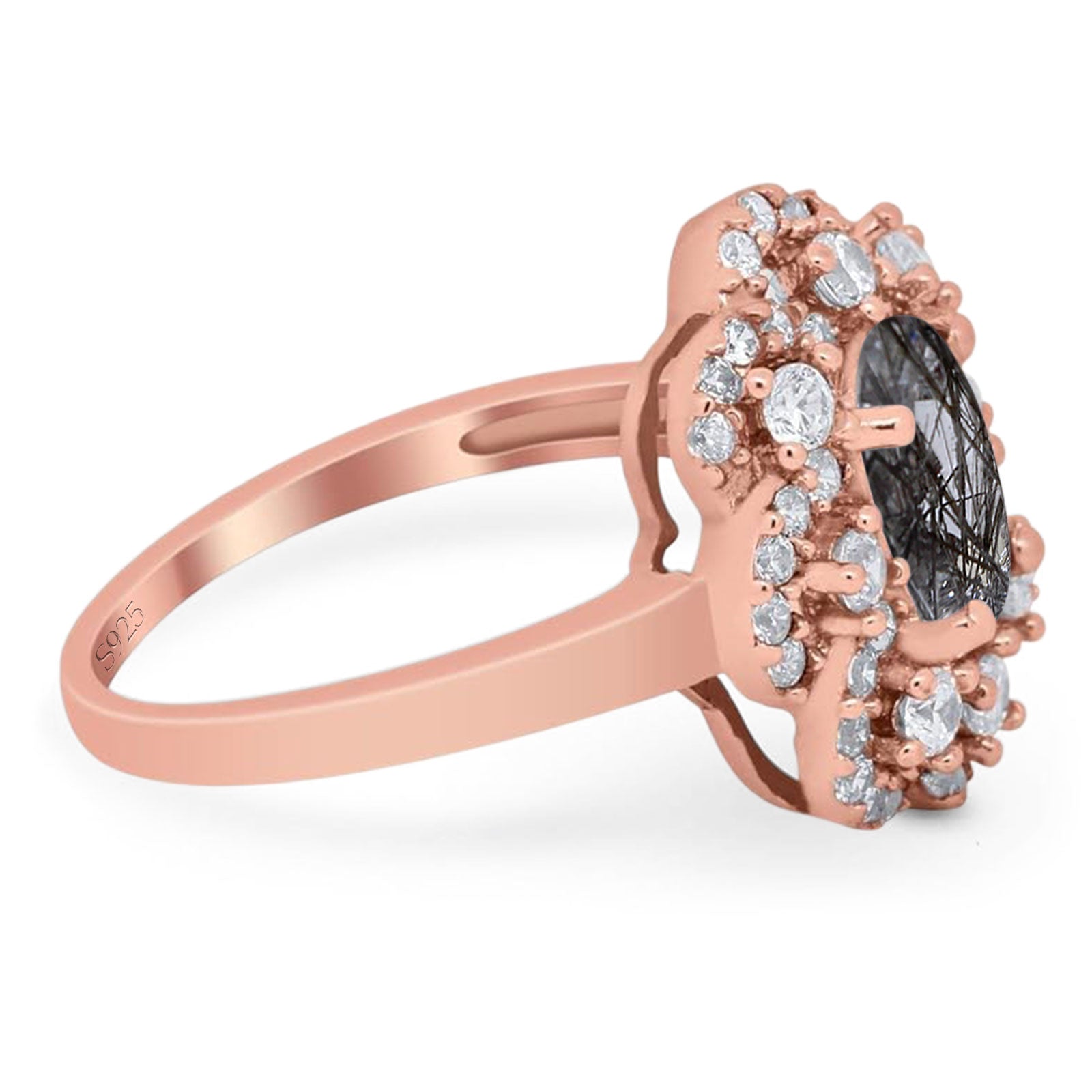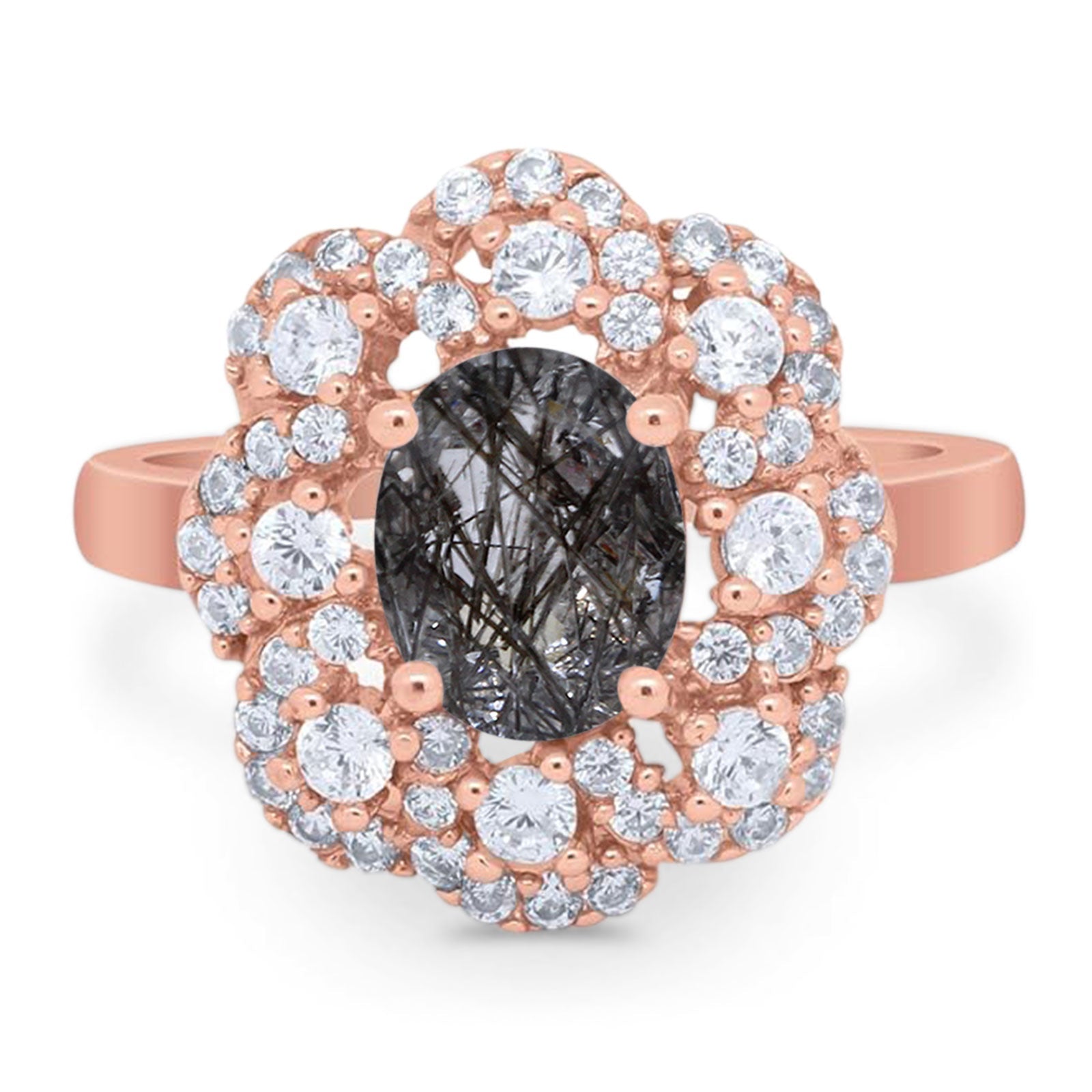 Vintage Style Oval Natural Rutilated Quartz Flower Ring 925 Sterling Silver