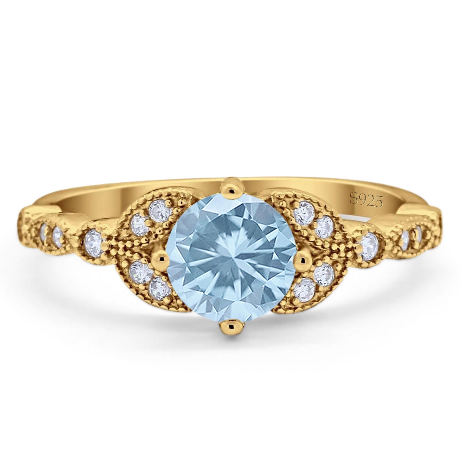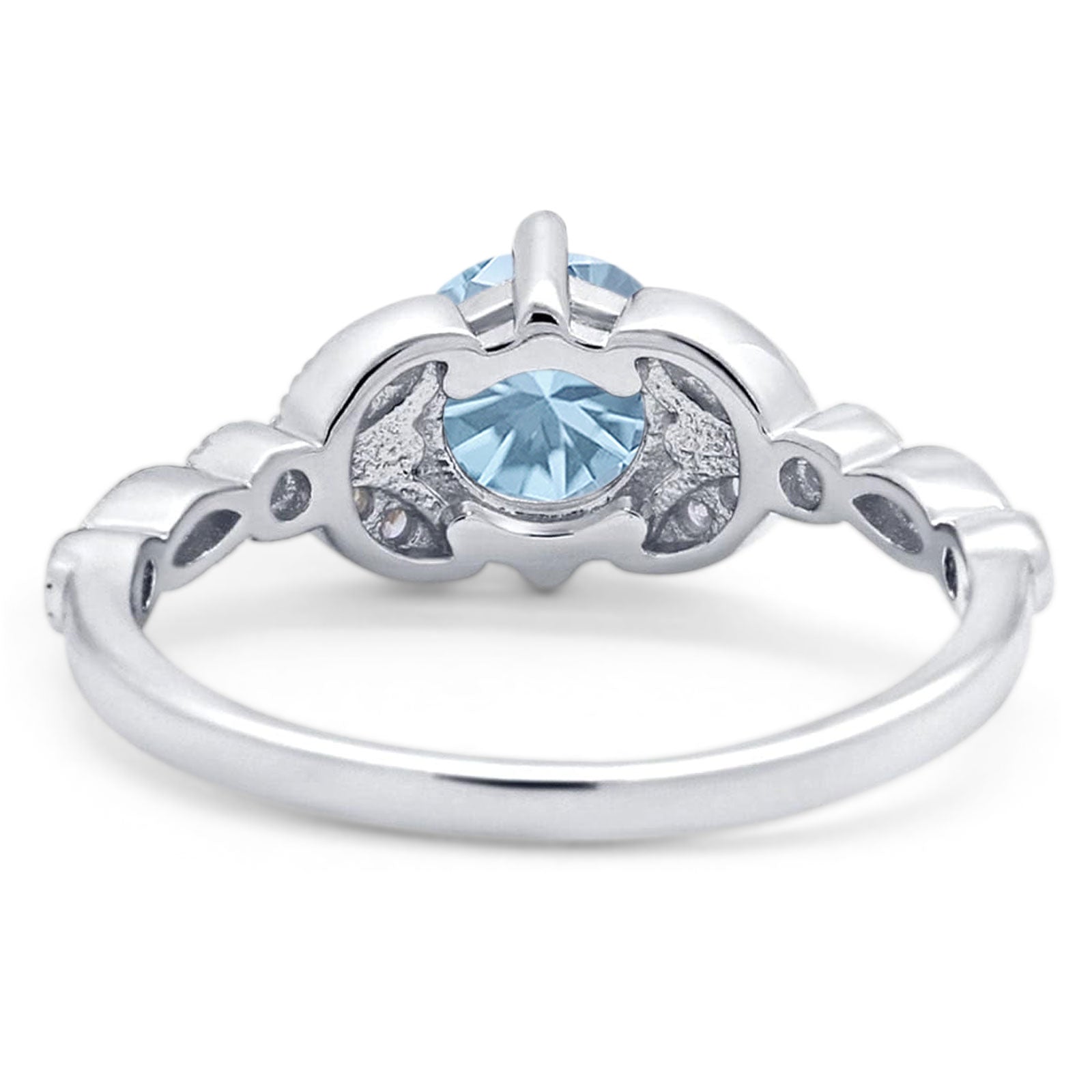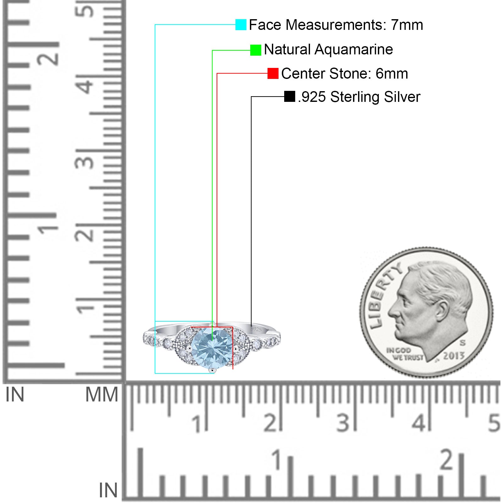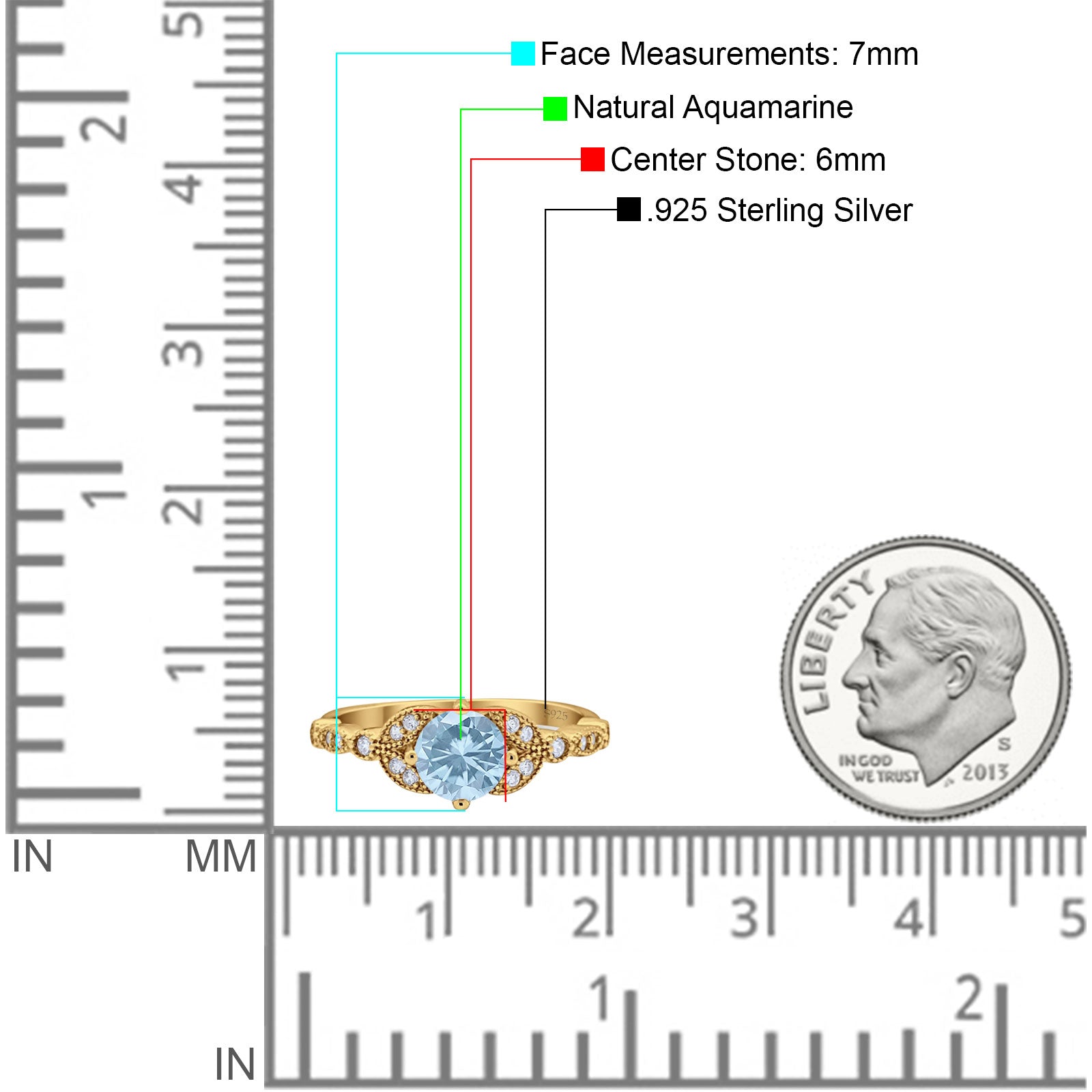 Vintage Style Round Natural Aquamarine Floral Leaf Accent Ring 925 Sterling Silver