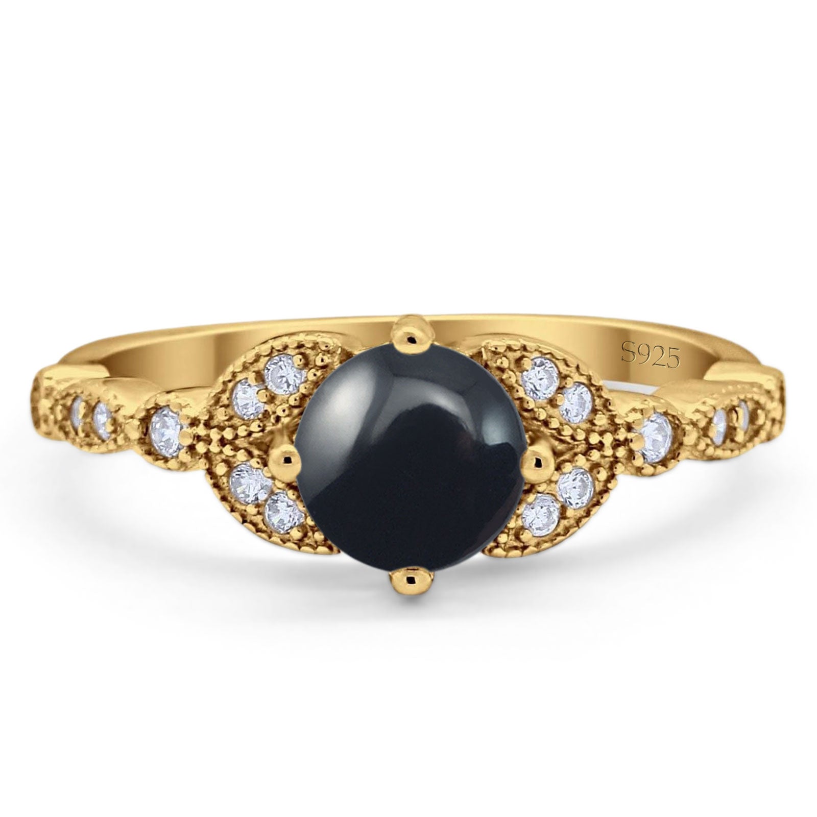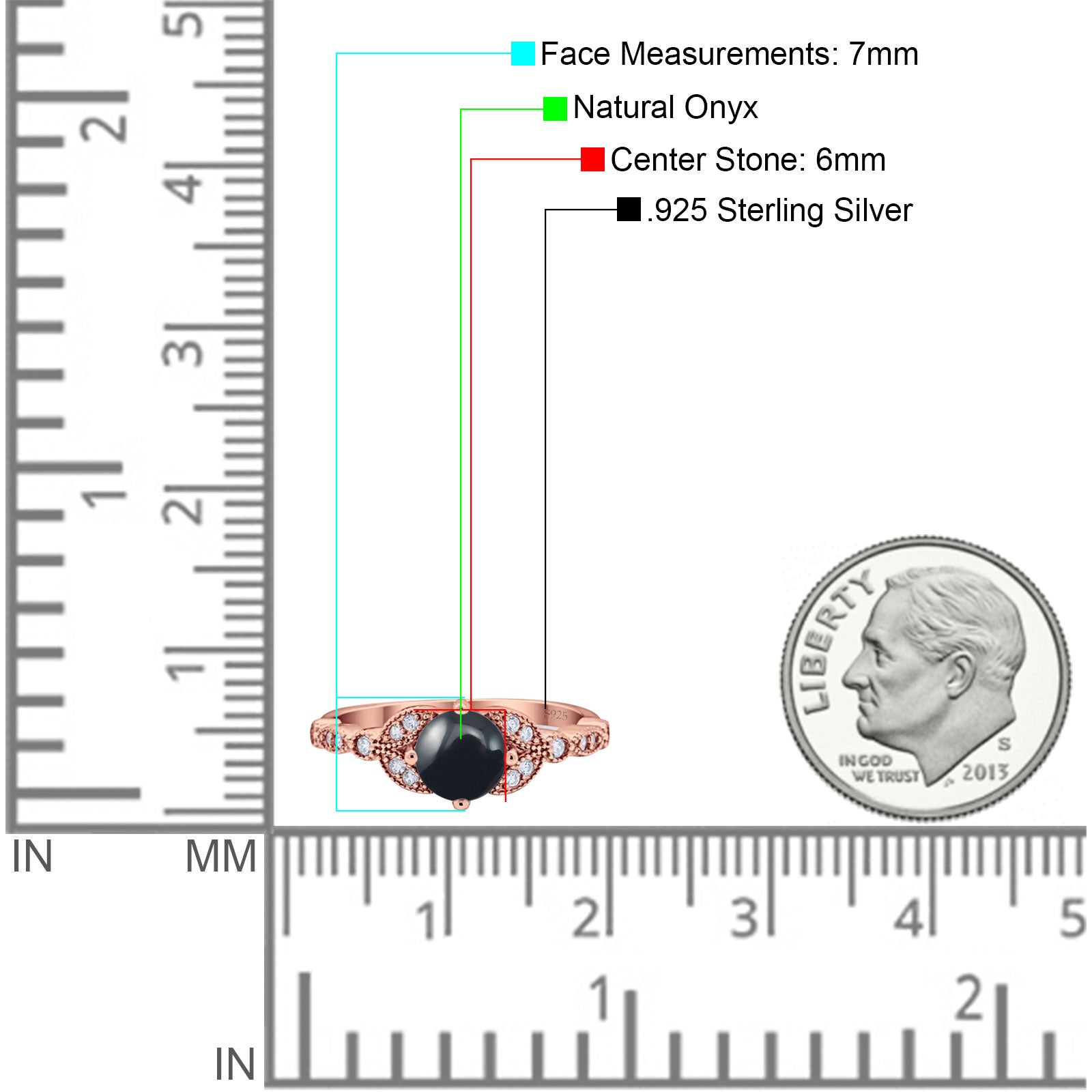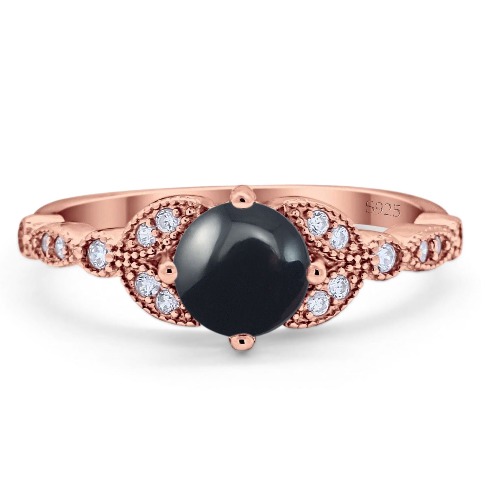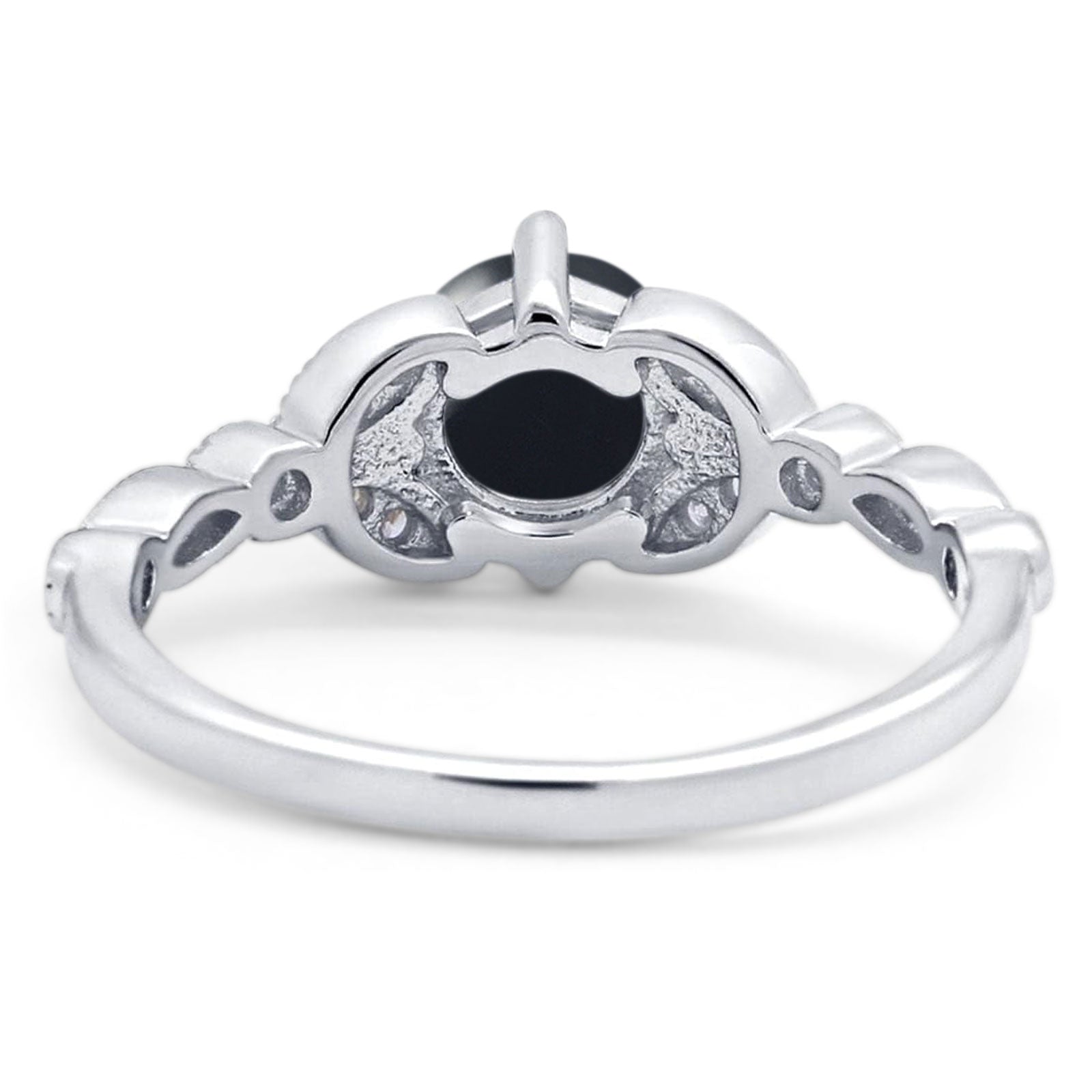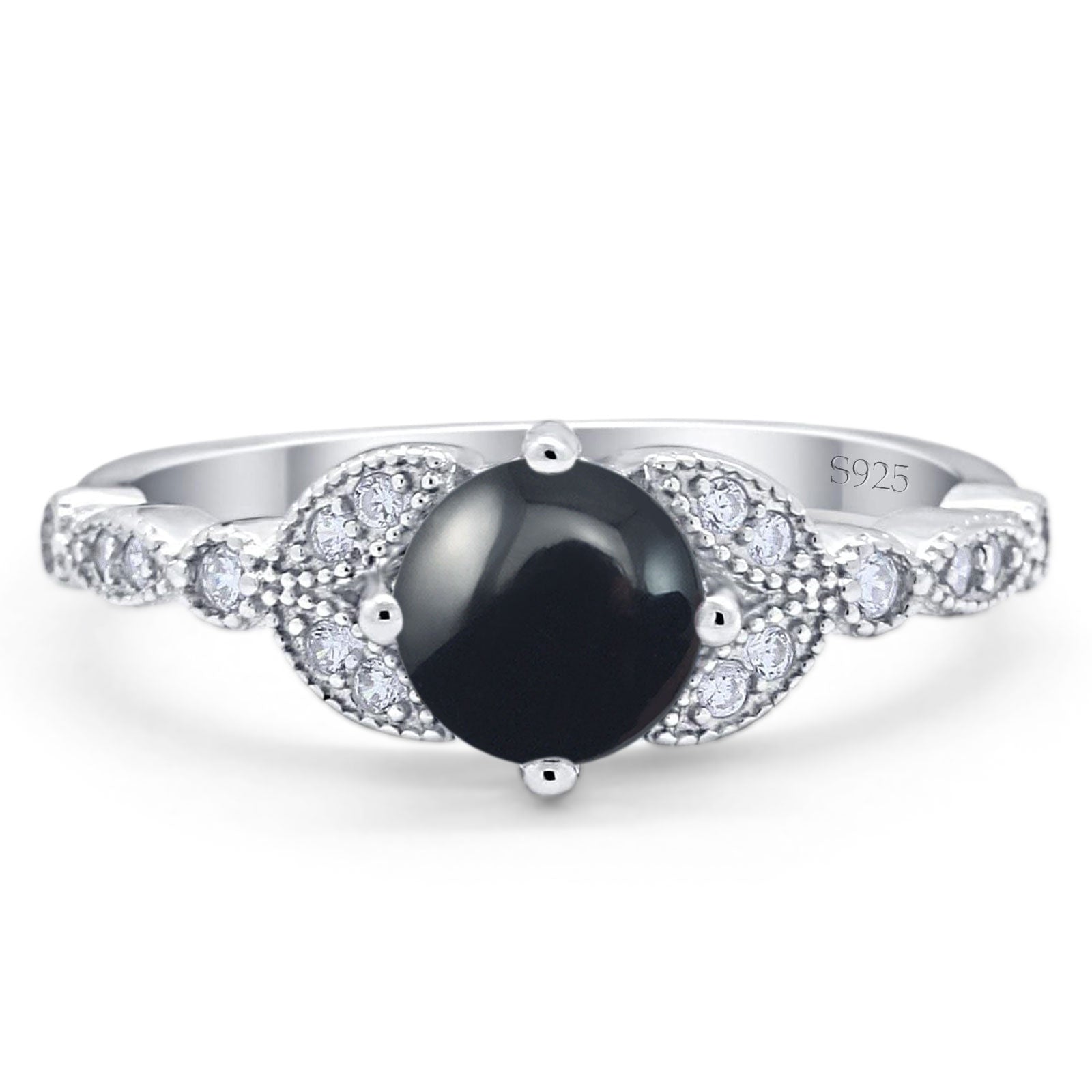 Vintage Style Round Natural Black Onyx Floral Leaf Accent Ring 925 Sterling Silver
