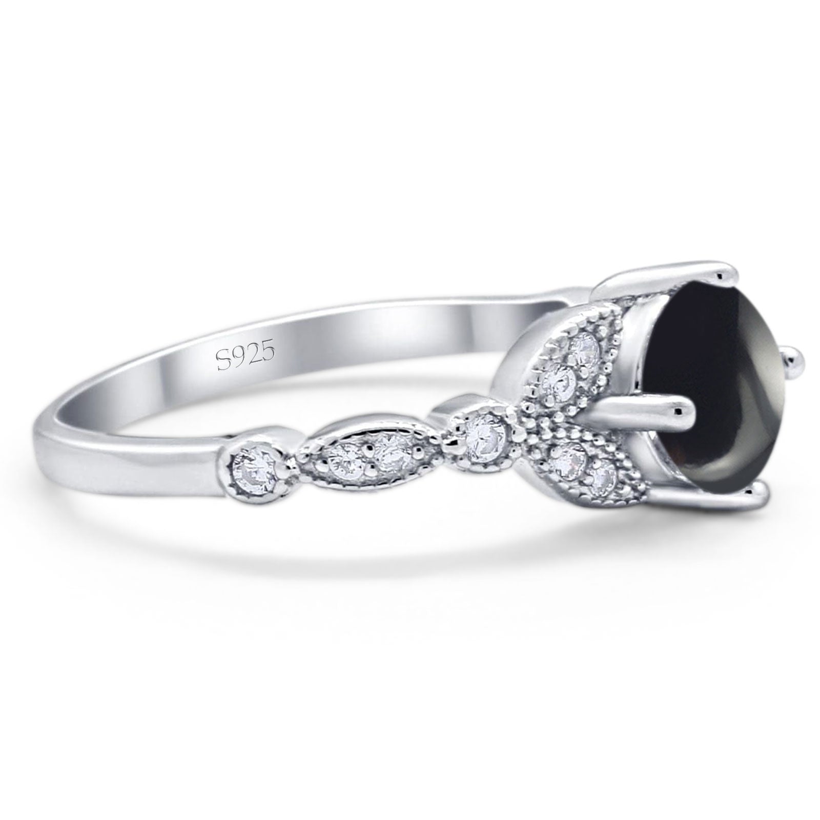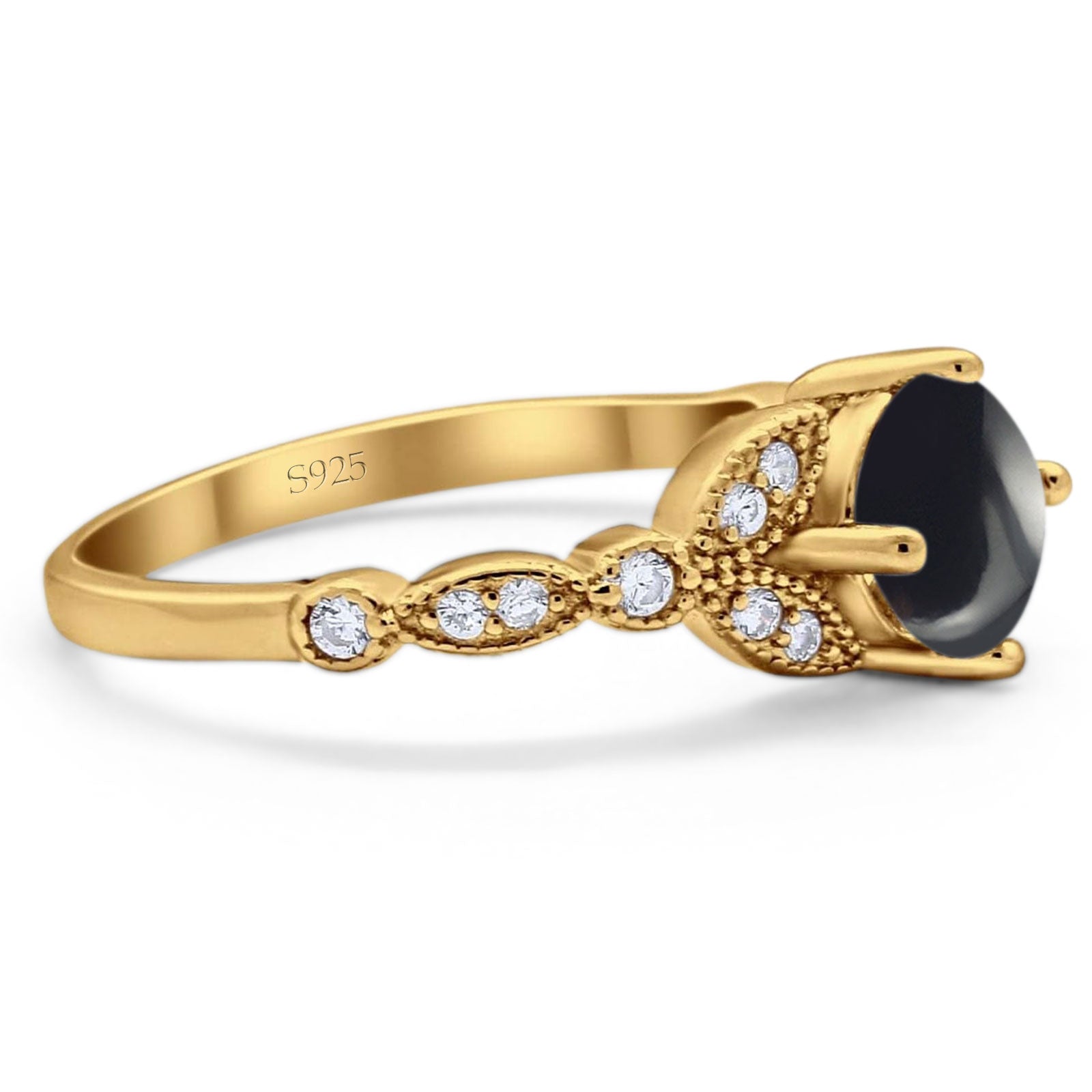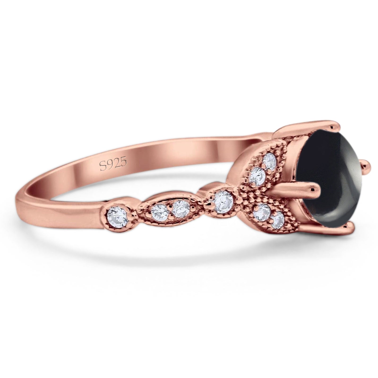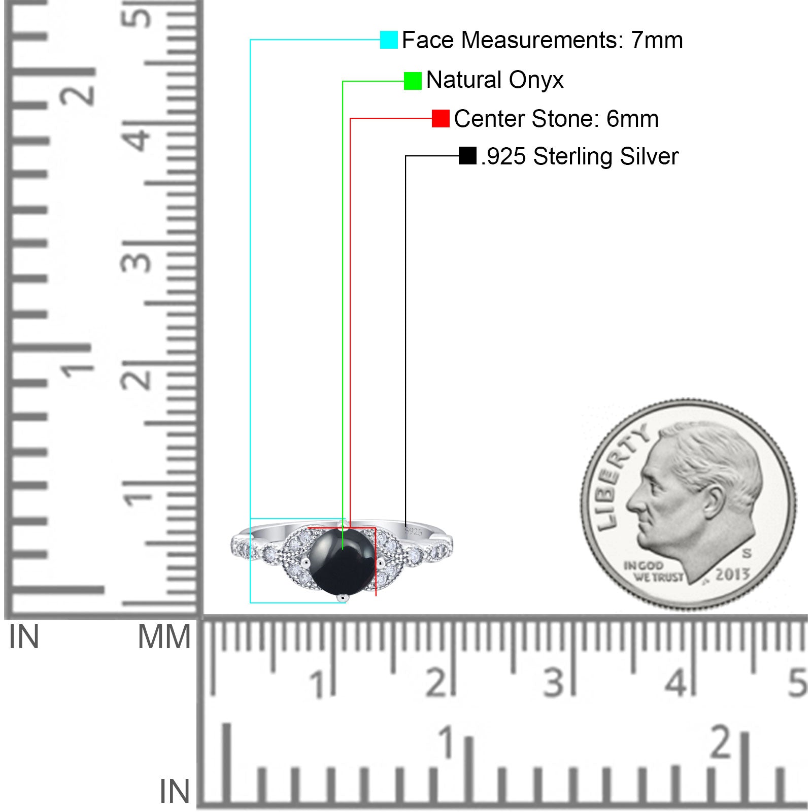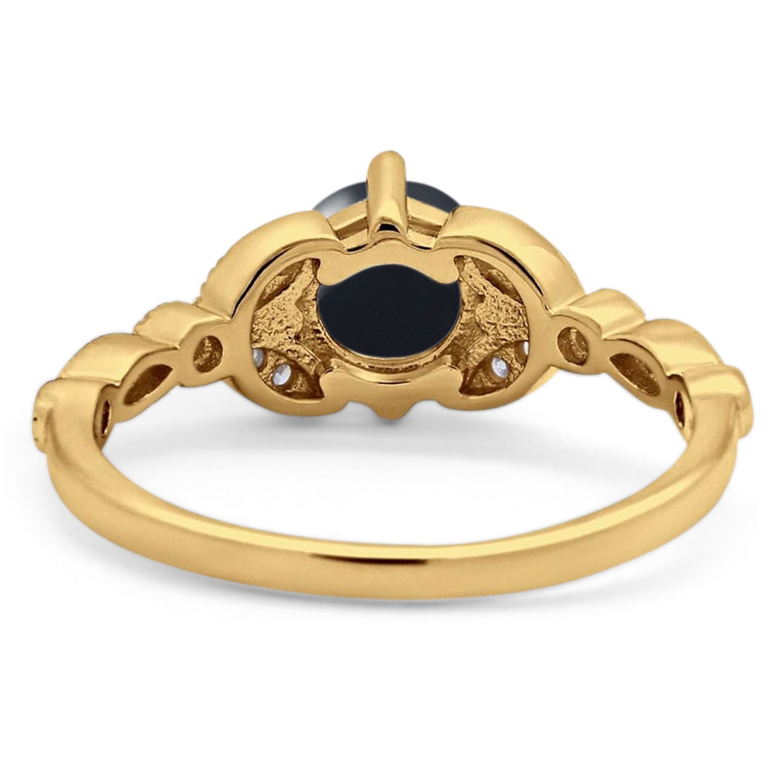 Vintage Style Round Natural Black Onyx Floral Leaf Accent Ring 925 Sterling Silver