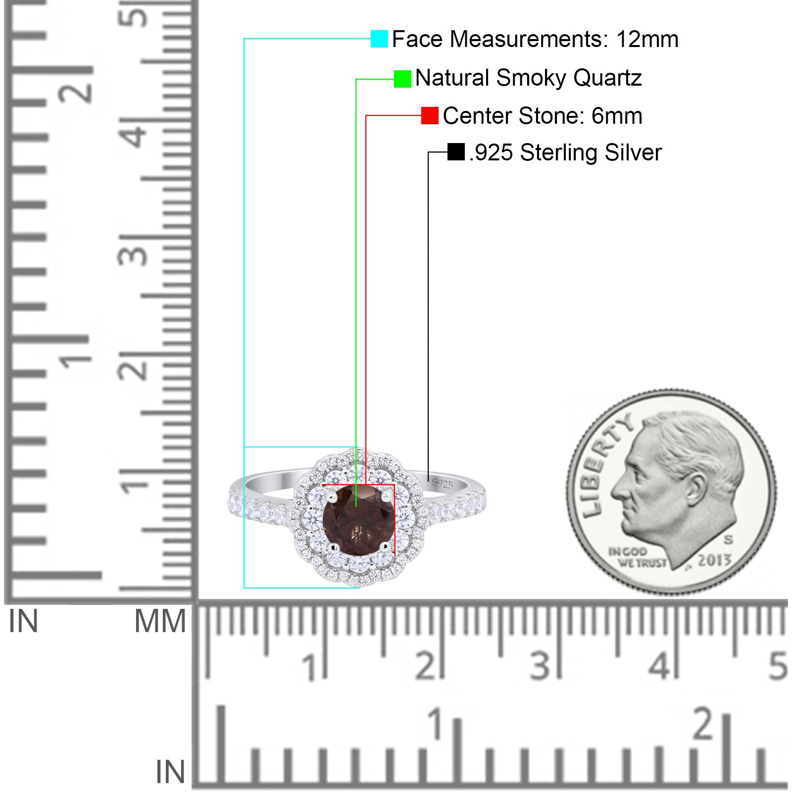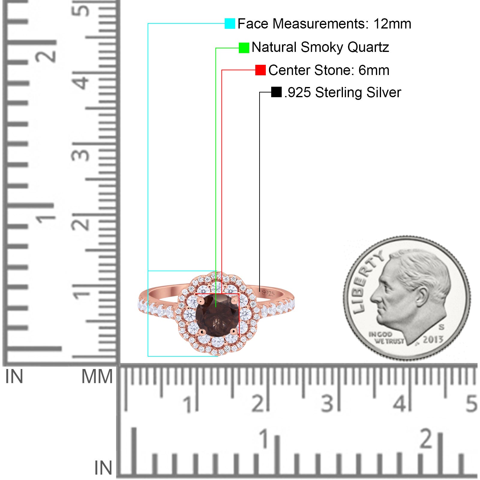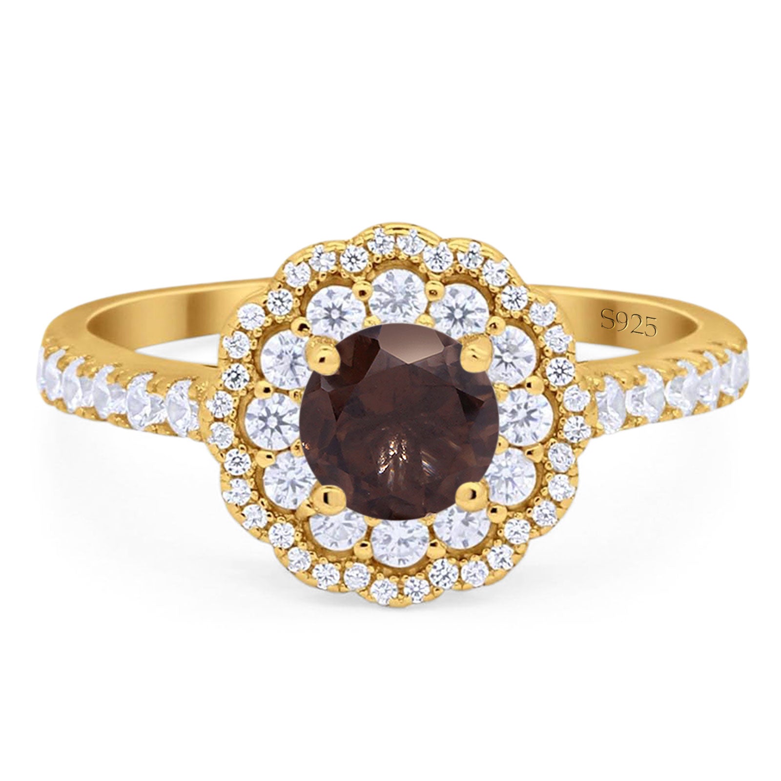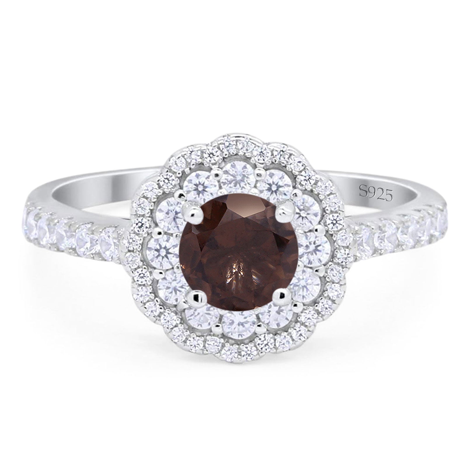 Vintage Style Round Natural Chocolate Smoky Quartz Halo Flower Ring 925 Sterling Silver