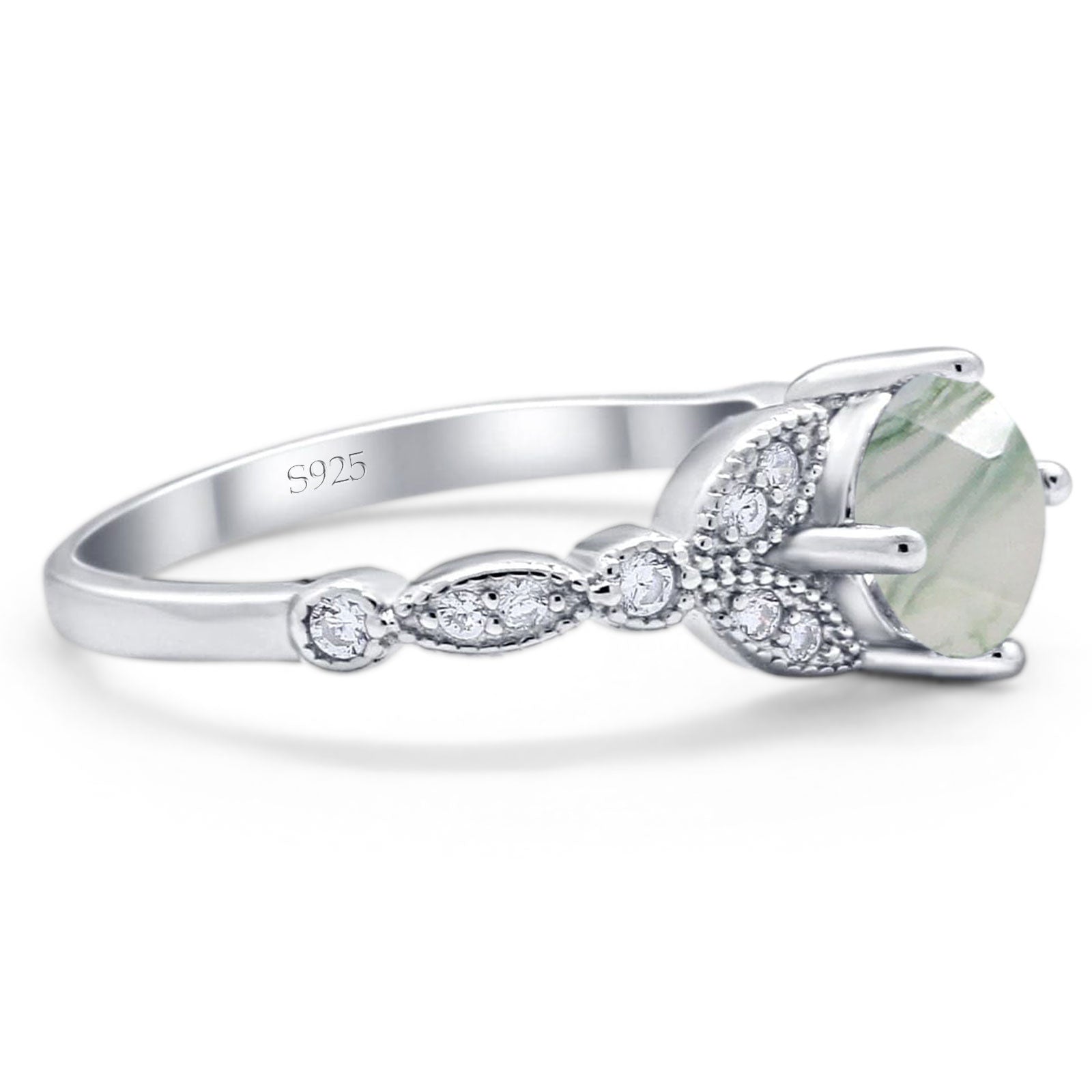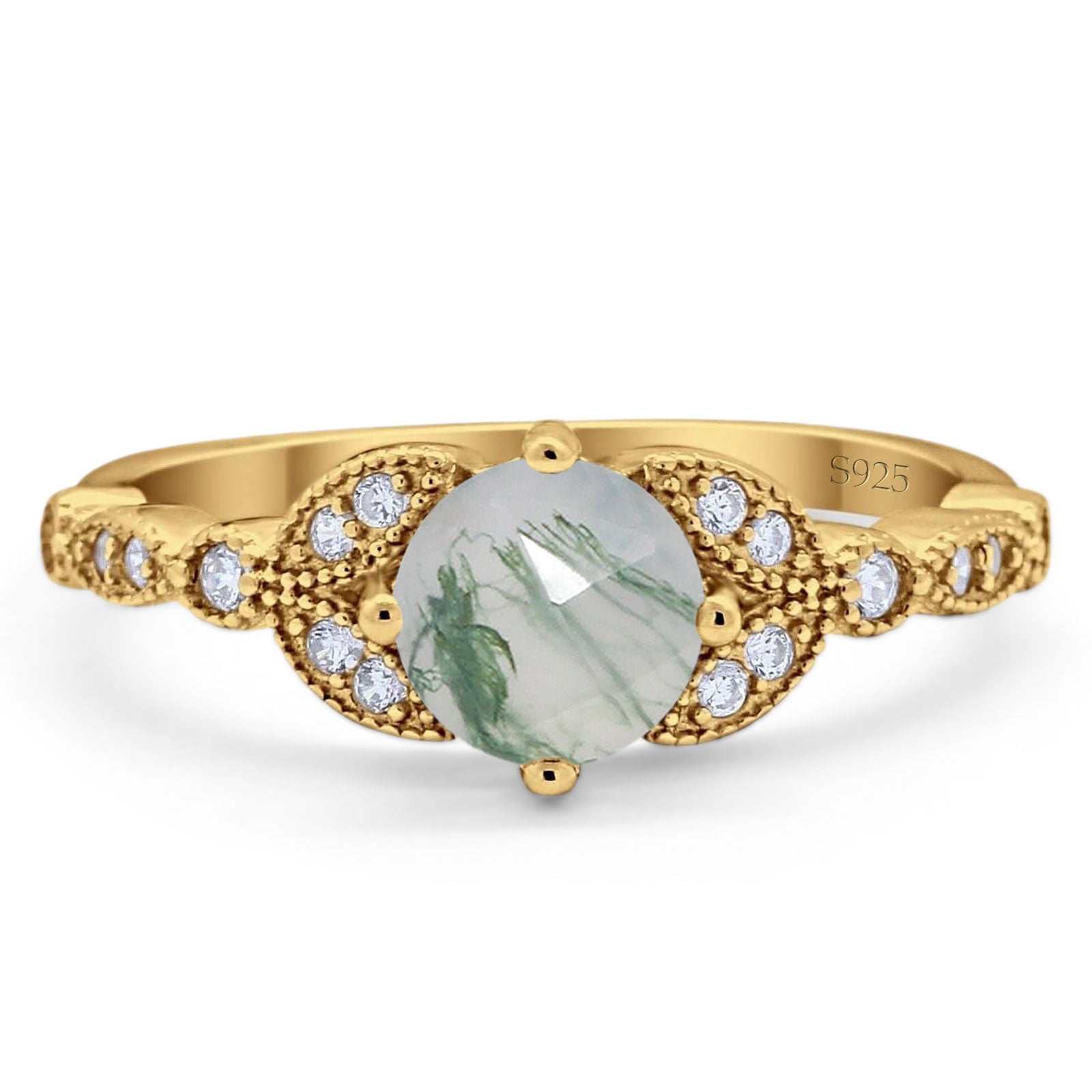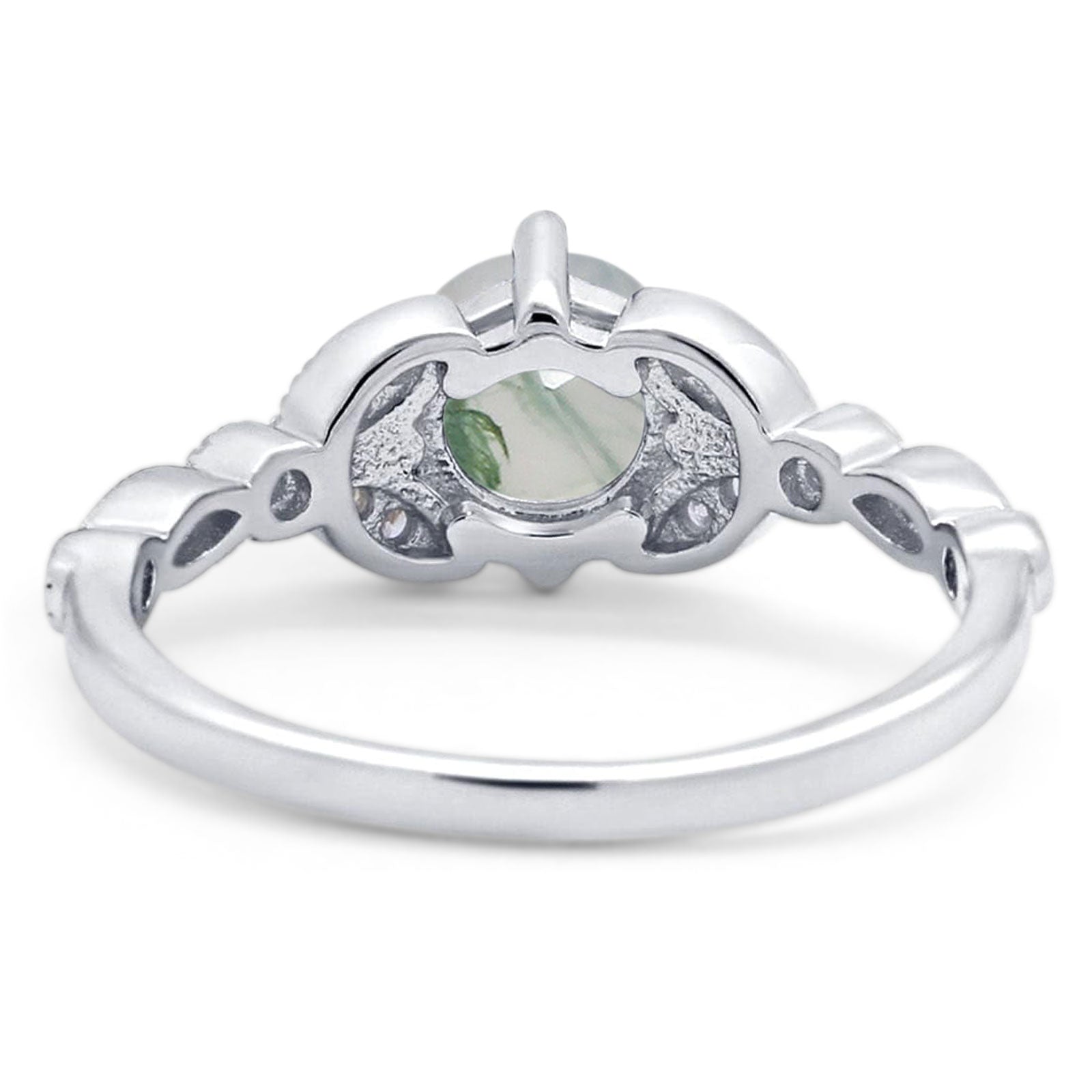 Vintage Style Round Natural Green Moss Agate Floral Leaf Accent Ring 925 Sterling Silver