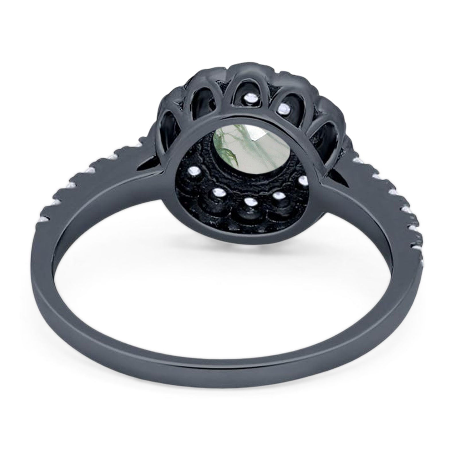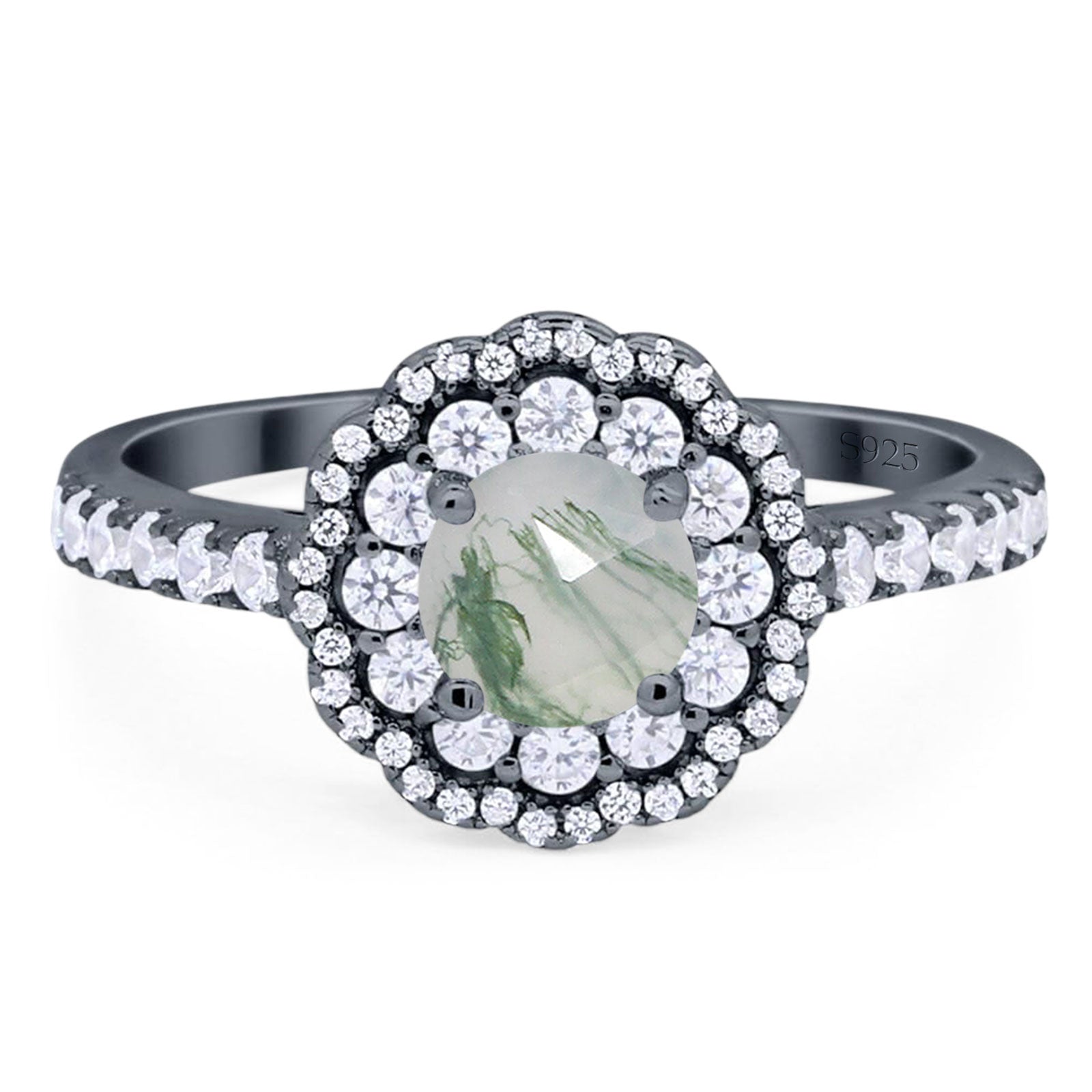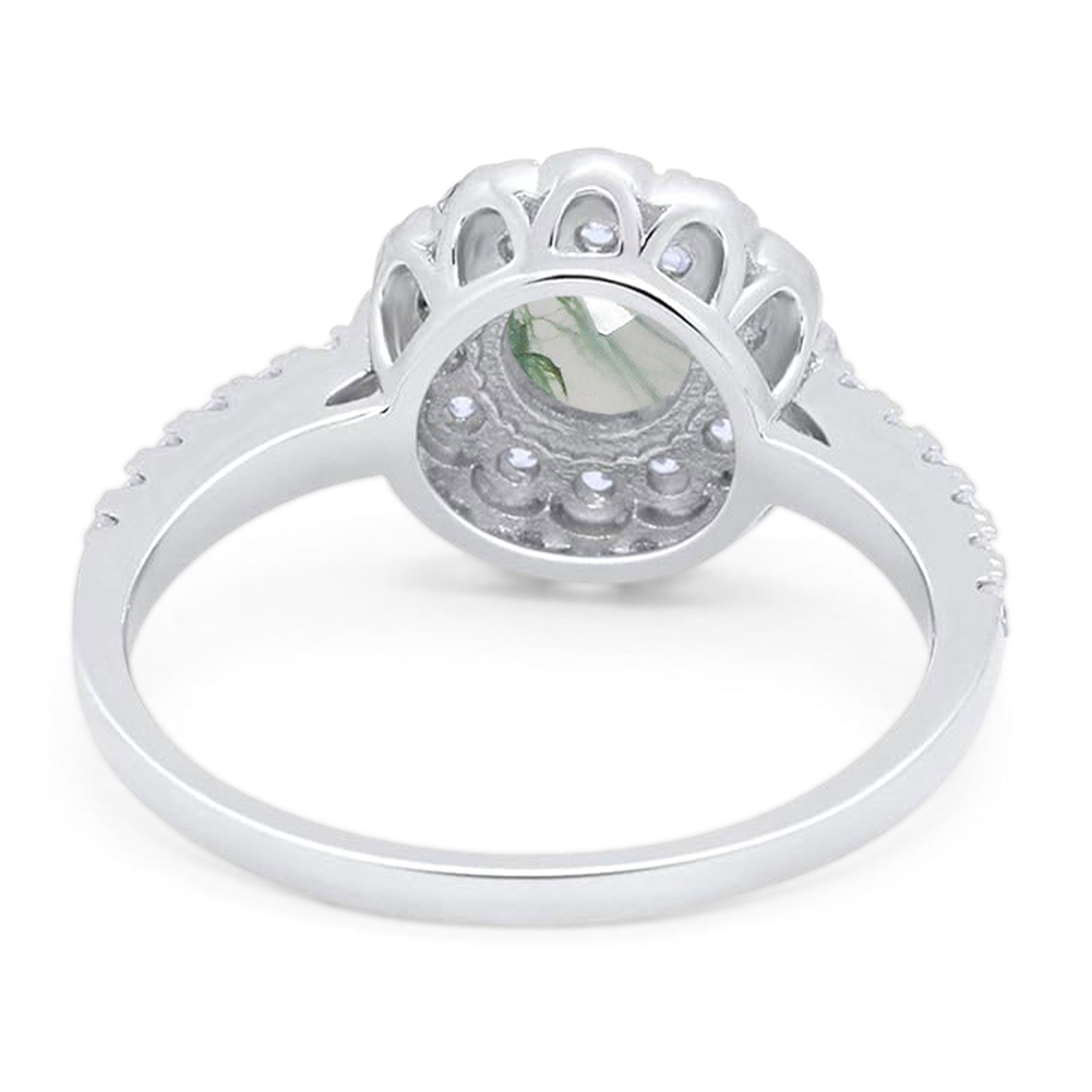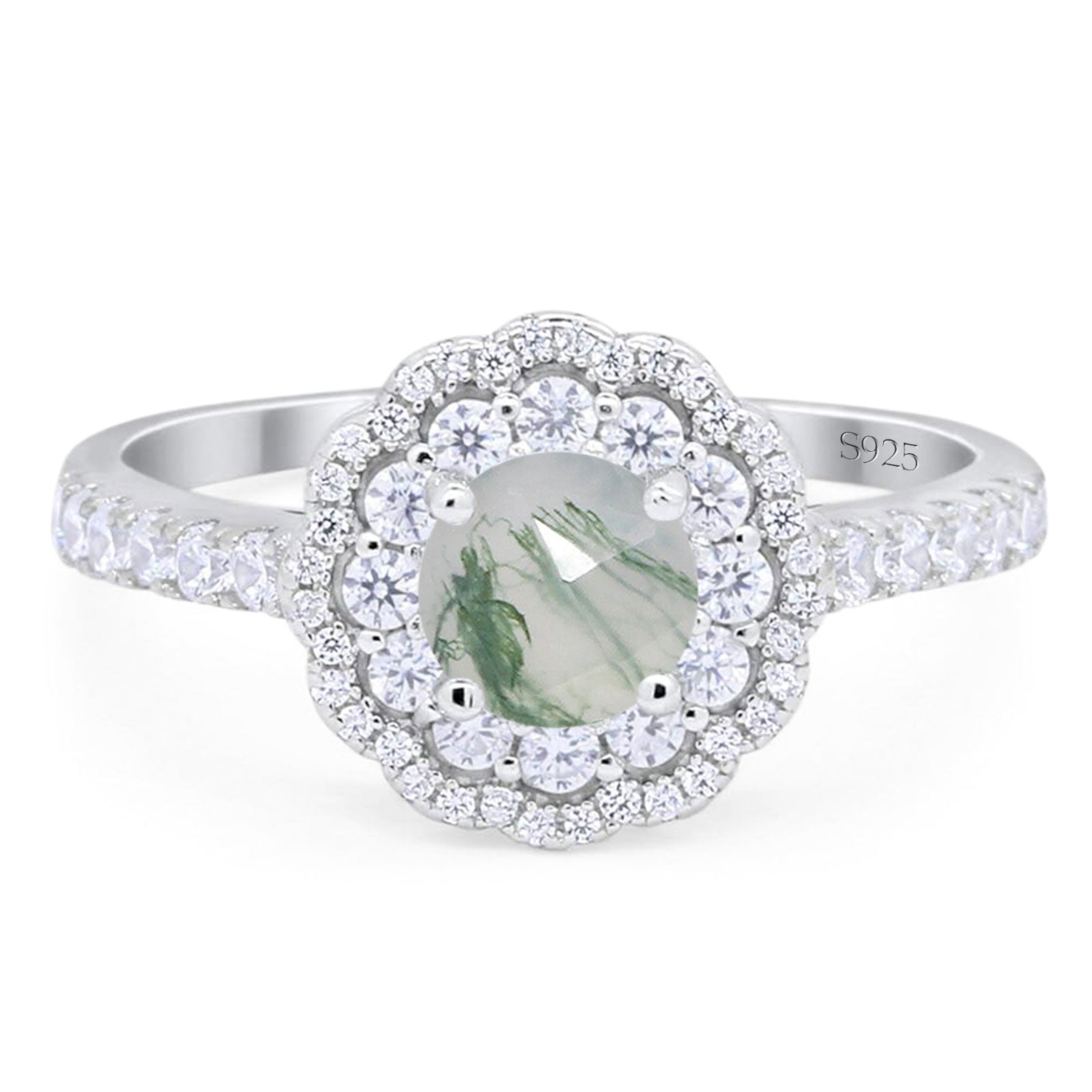Vintage Style Round Natural Green Moss Agate Halo Flower Ring 925 Sterling Silver
