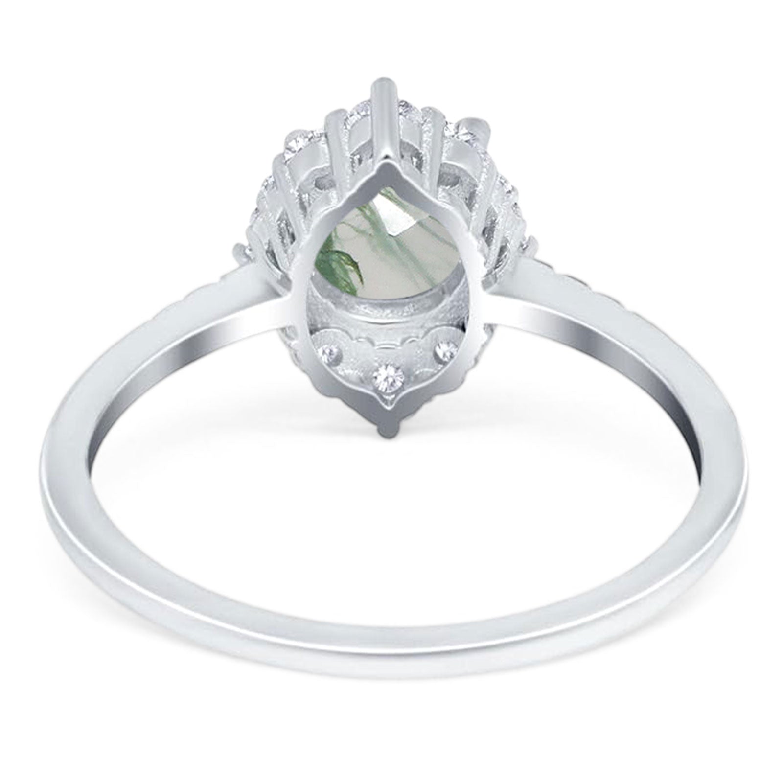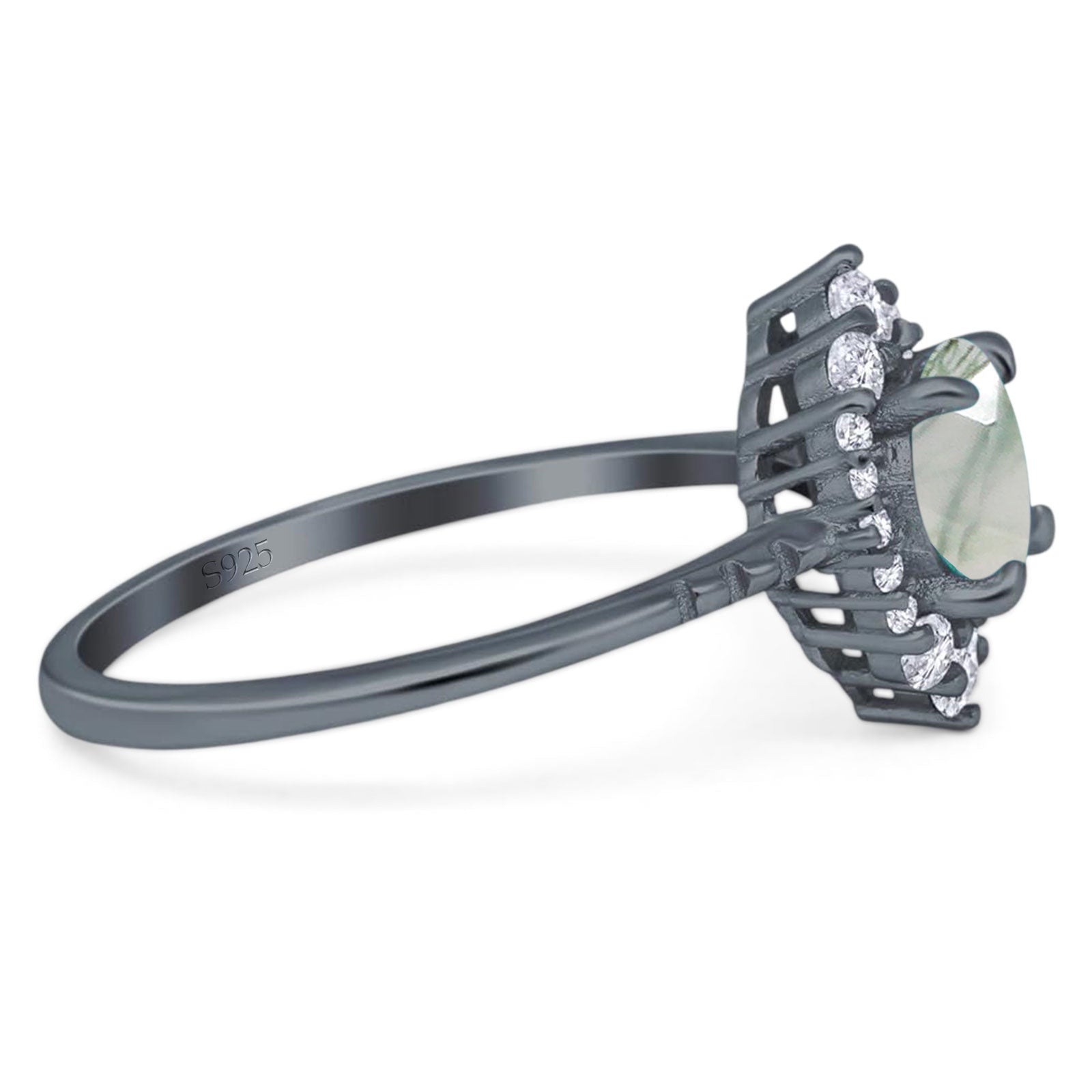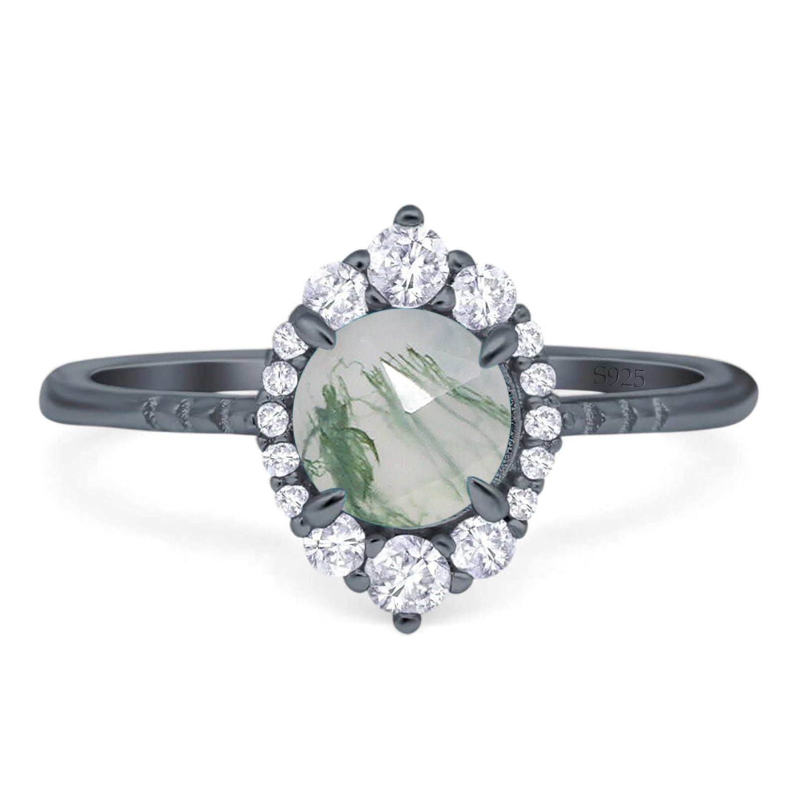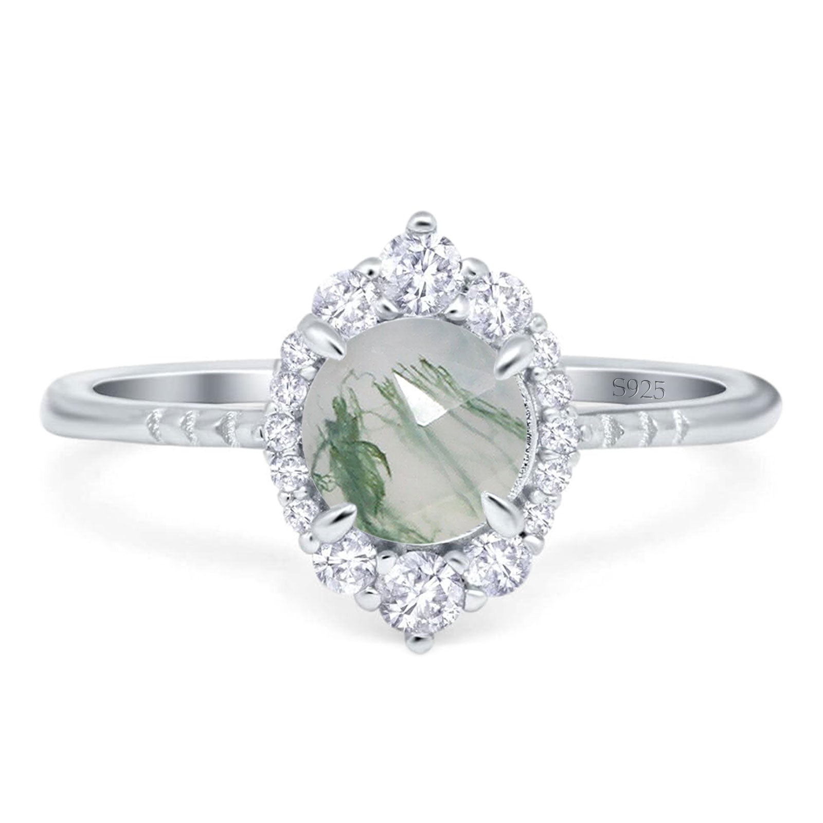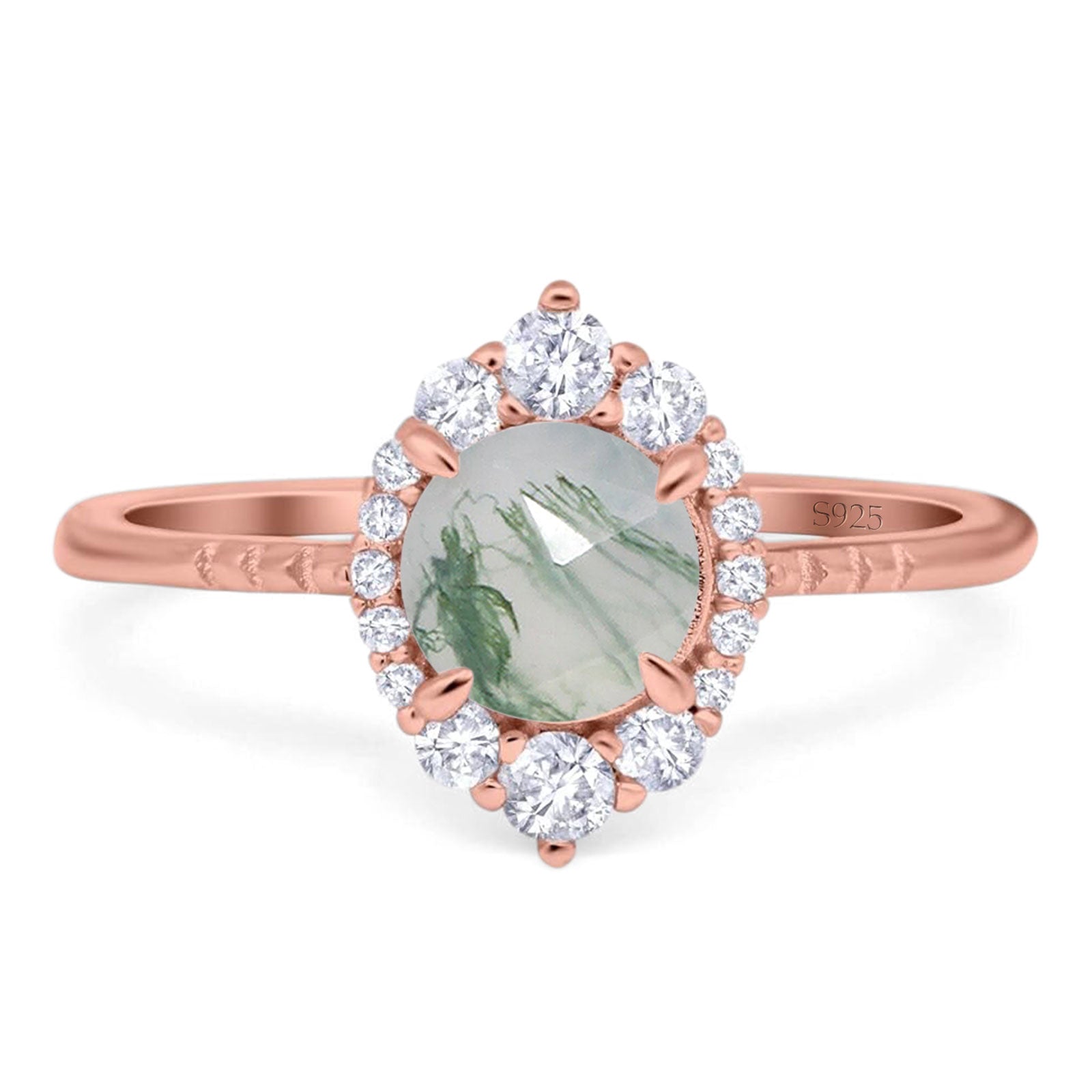 Vintage Style Round Natural Green Moss Agate Halo Wedding Ring 925 Sterling Silver