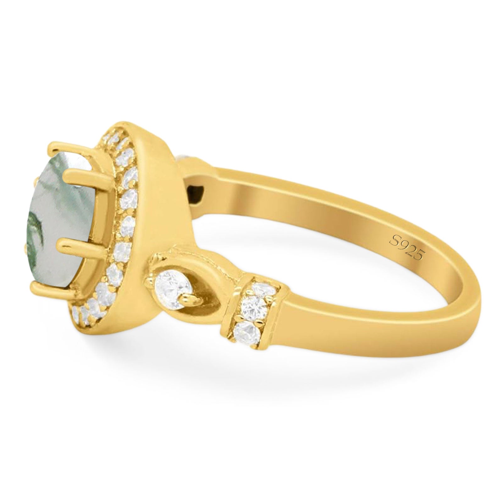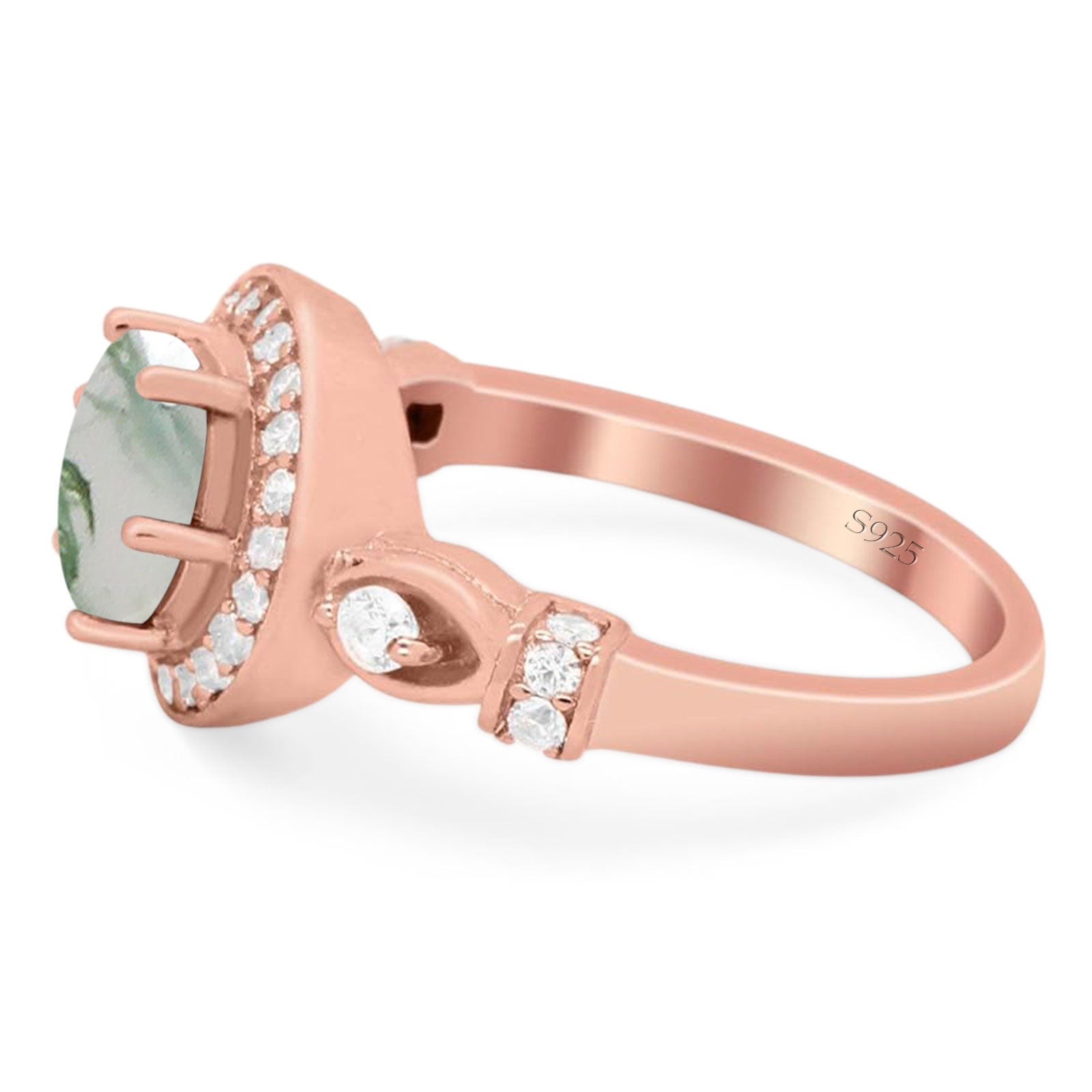 Vintage Style Round Natural Green Moss Agate Halo Wedding Ring 925 Sterling Silver