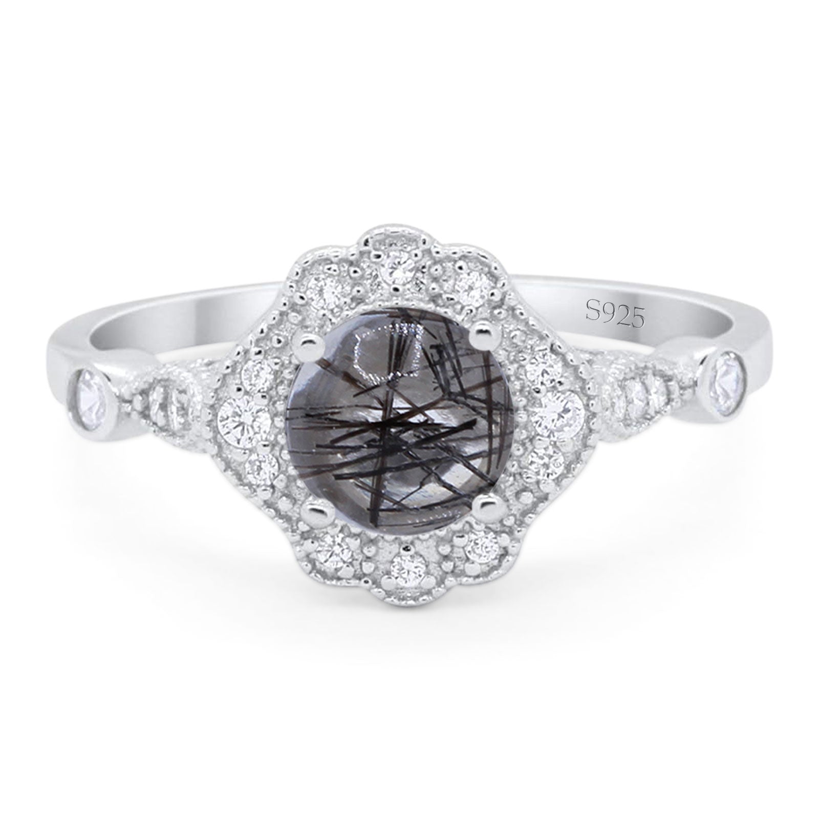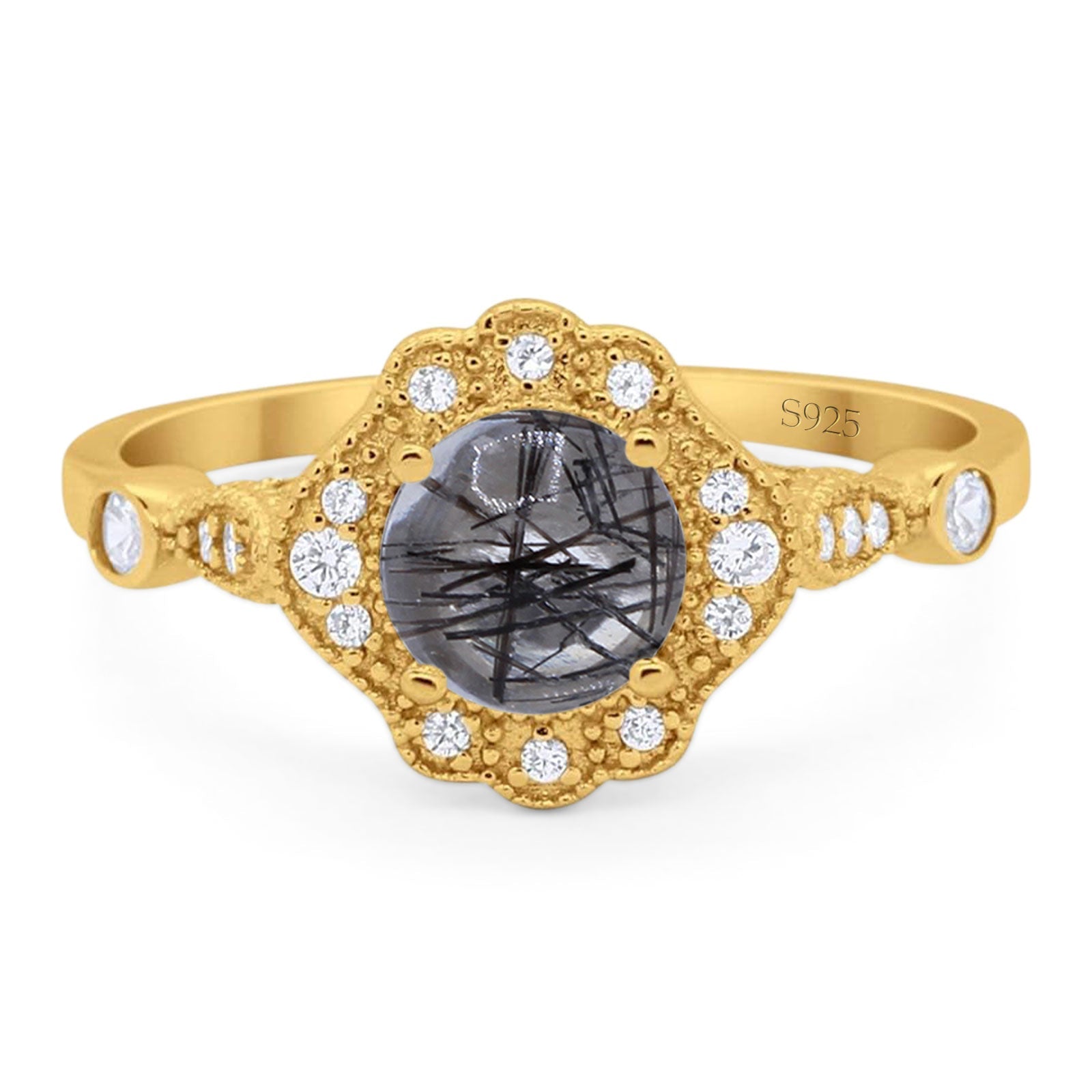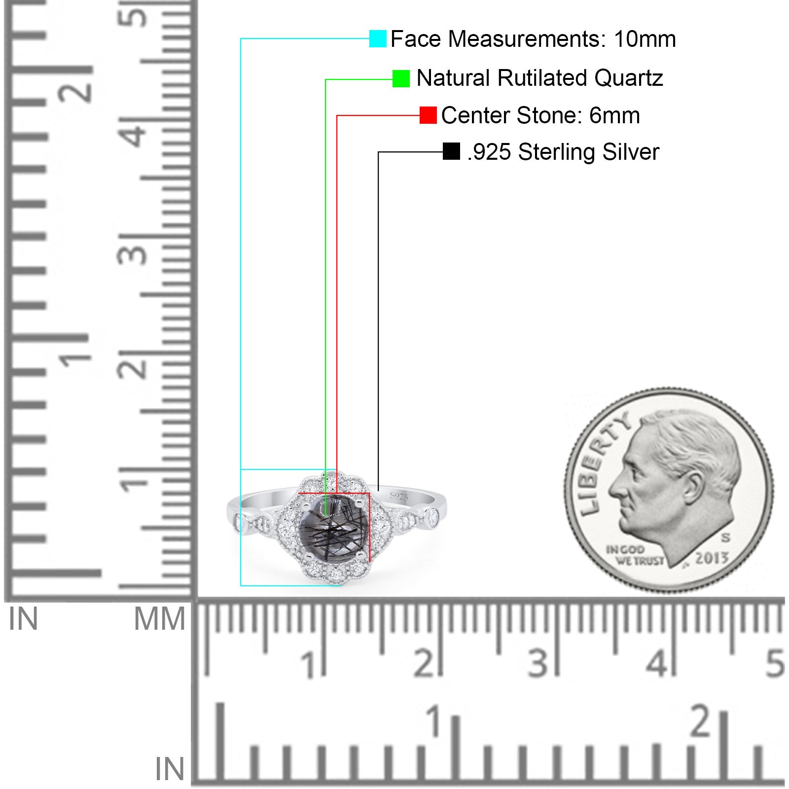 Vintage Style Round Natural Rutilated Quartz Art Deco Ring 925 Sterling Silver