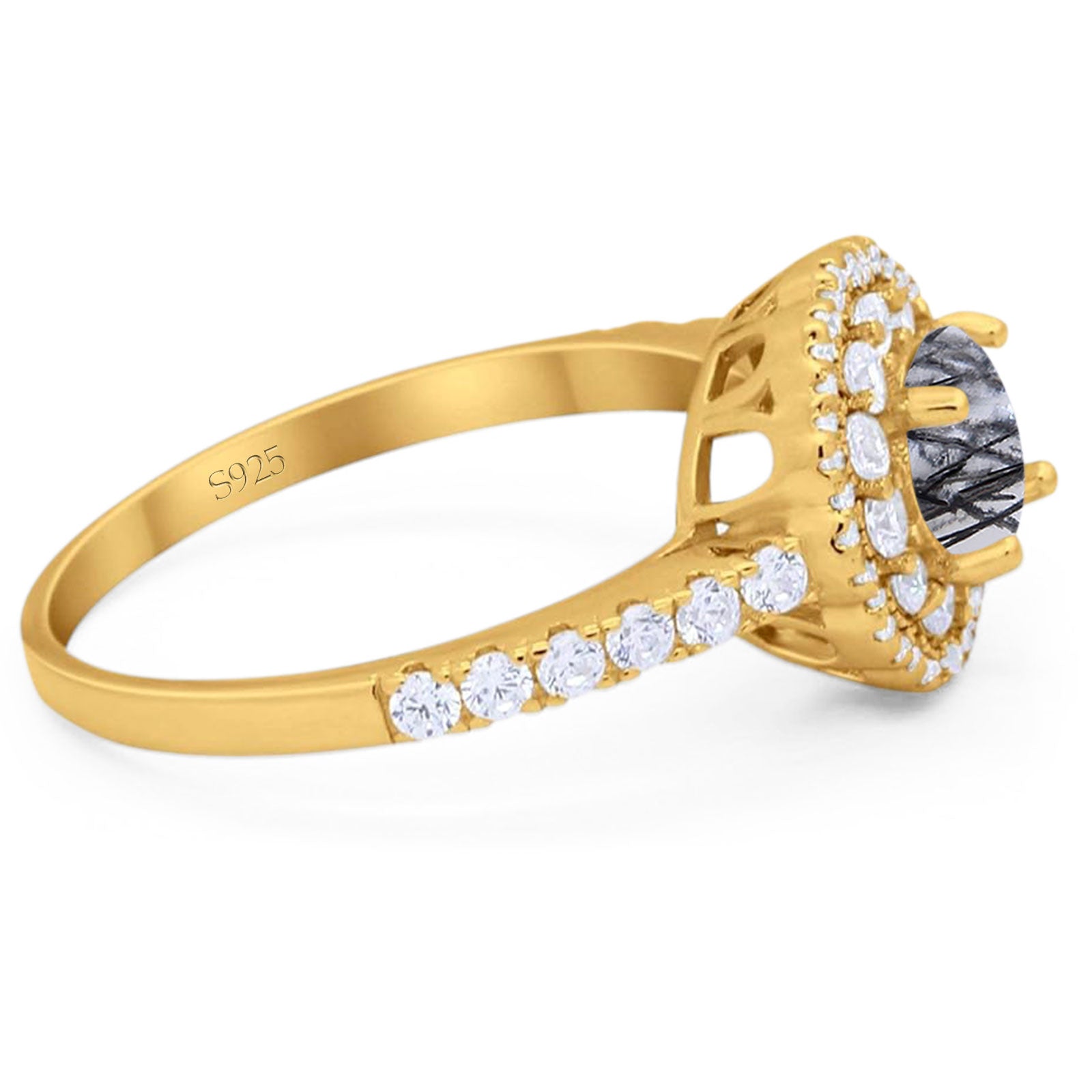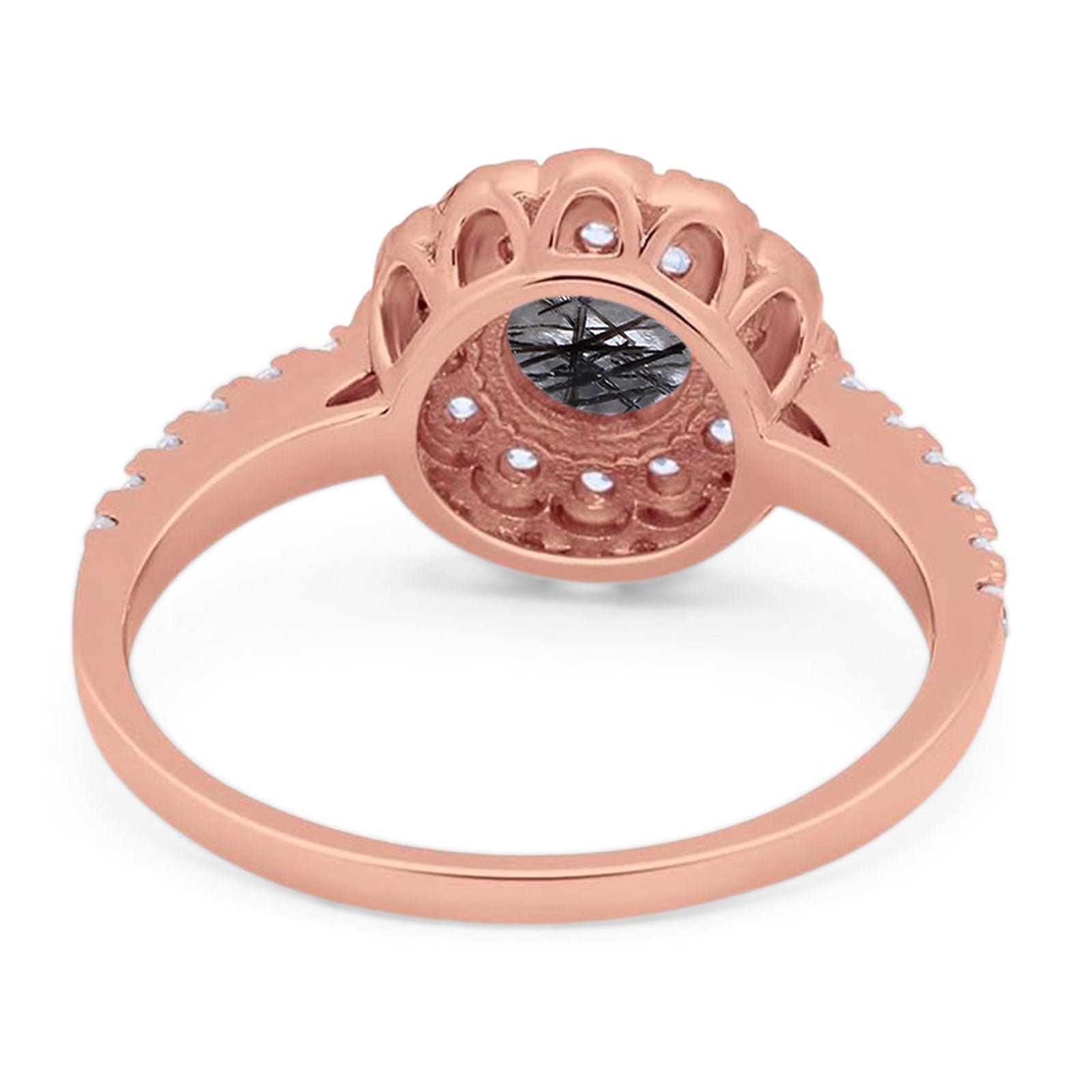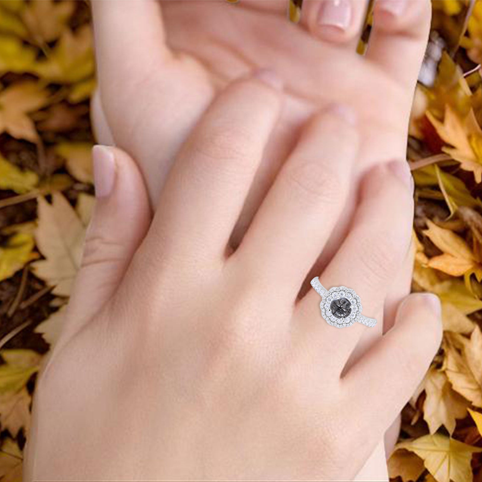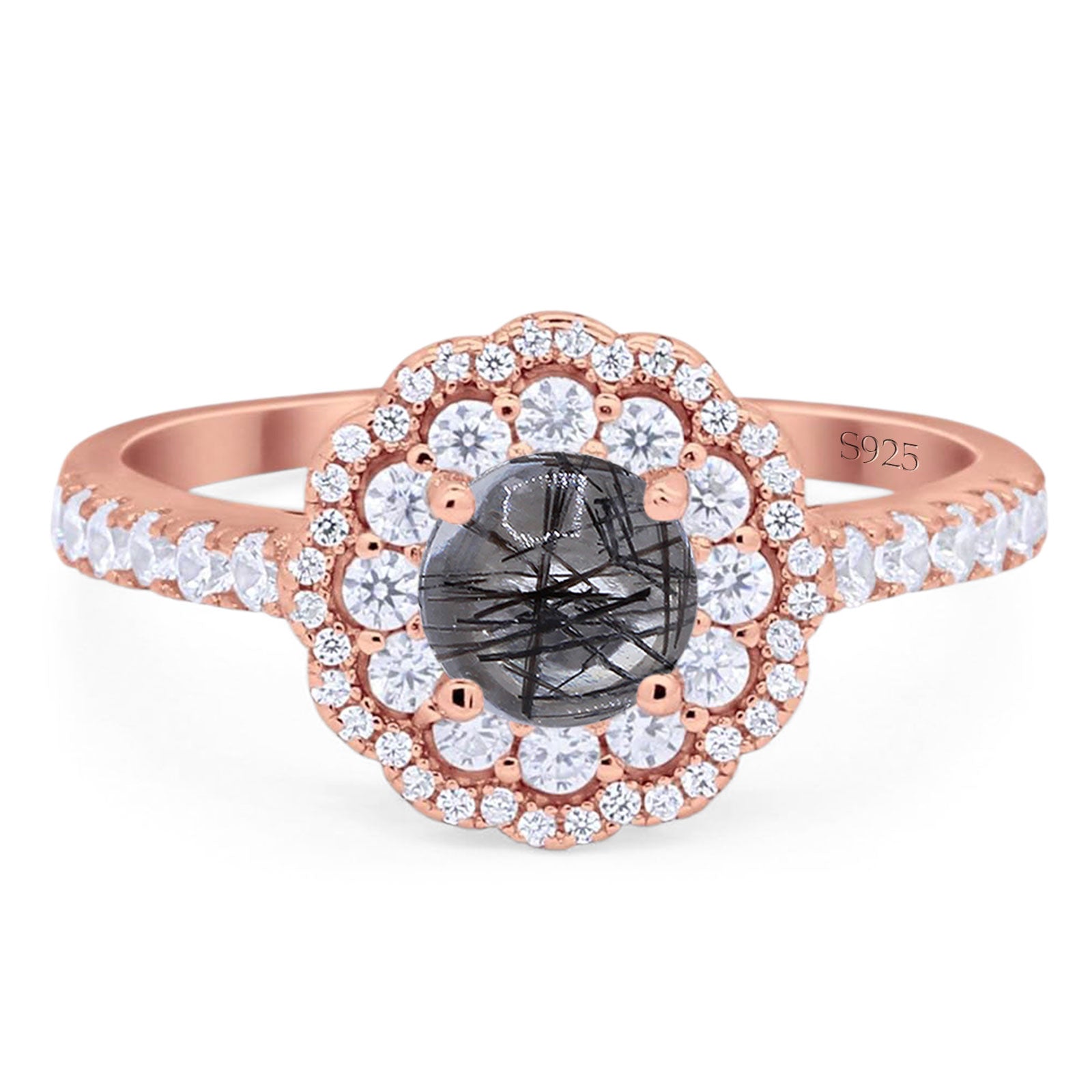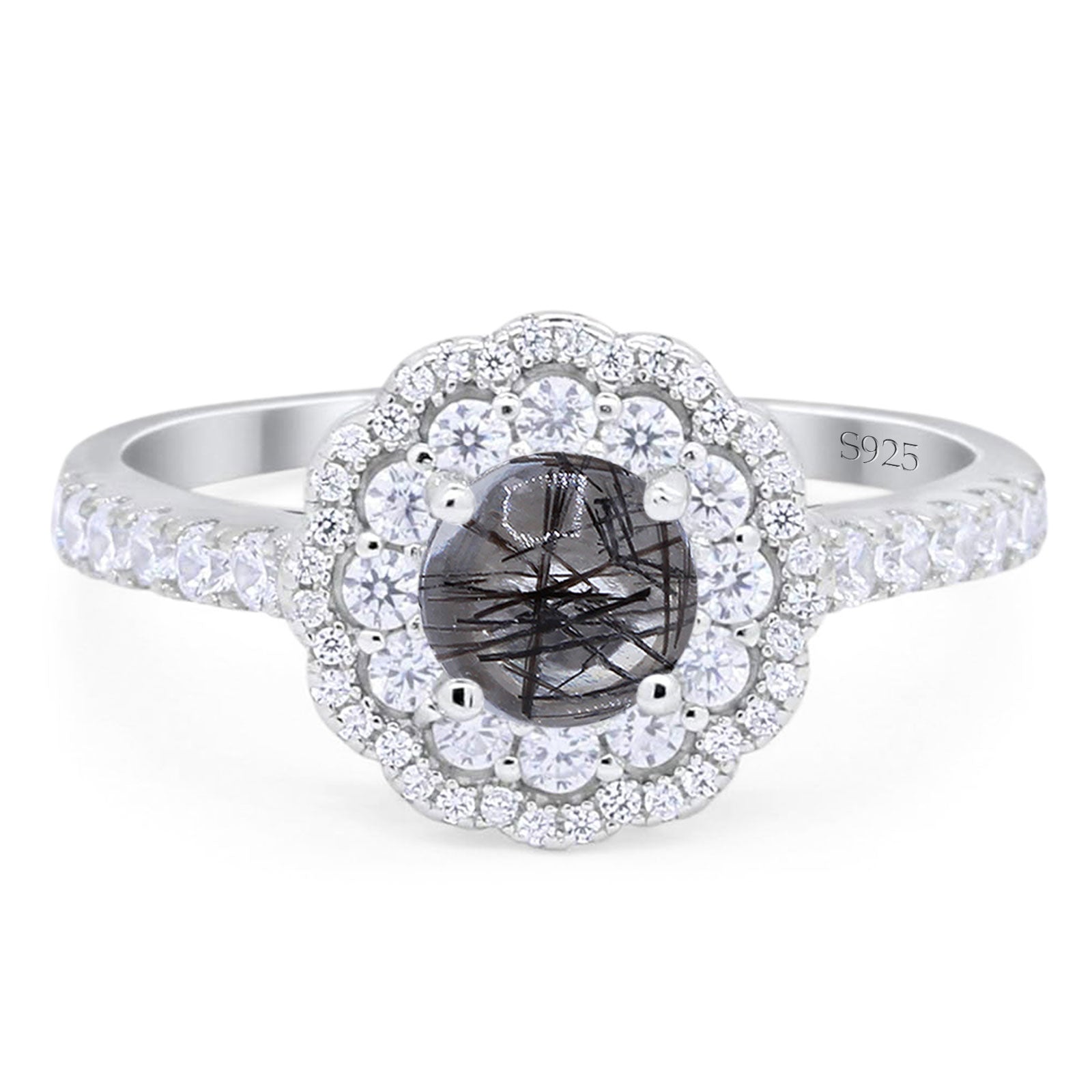 Vintage Style Round Natural Rutilated Quartz Halo Flower Ring 925 Sterling Silver