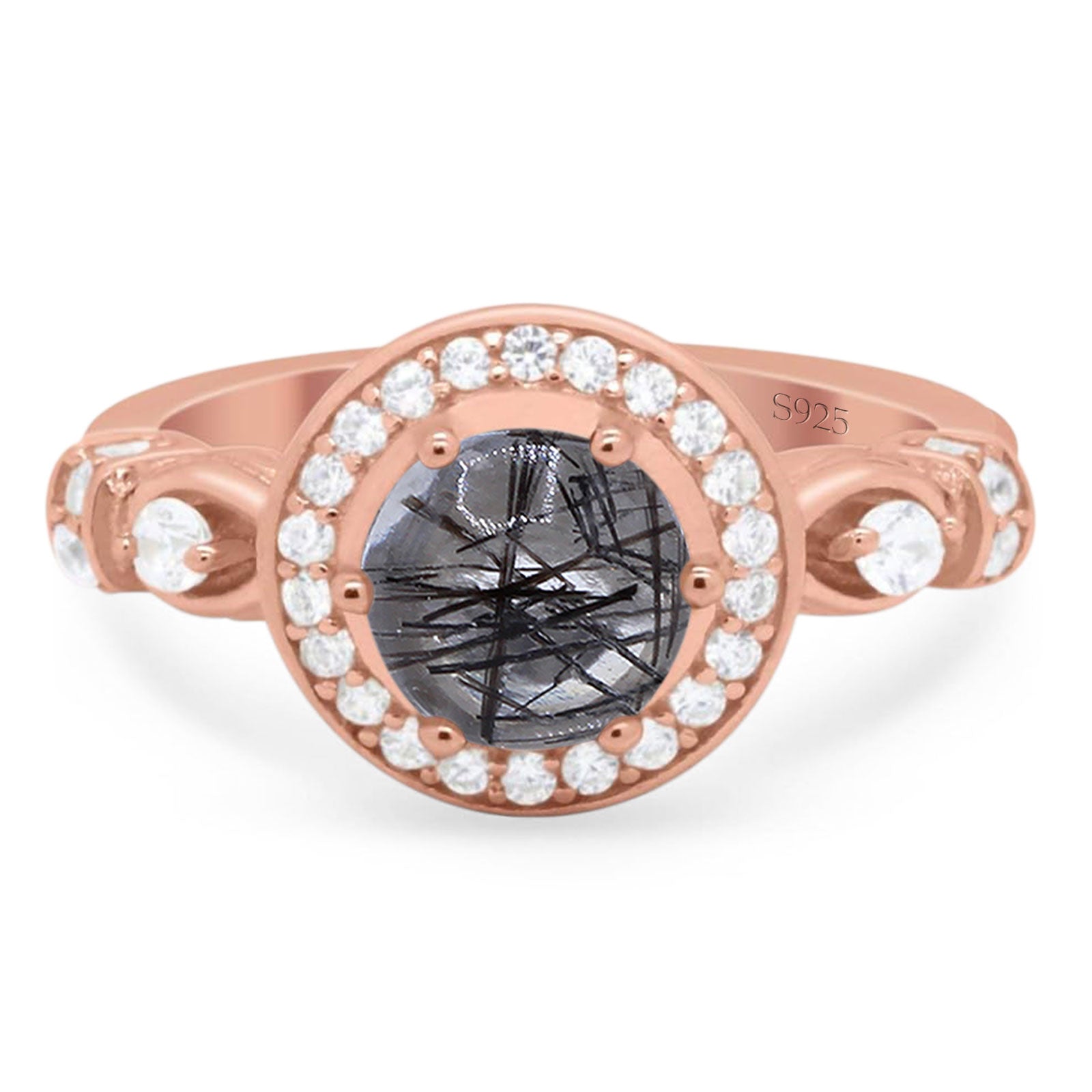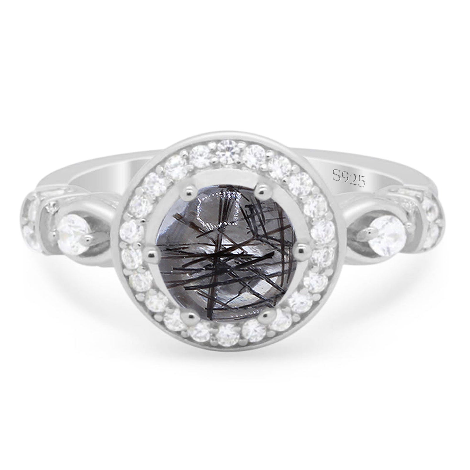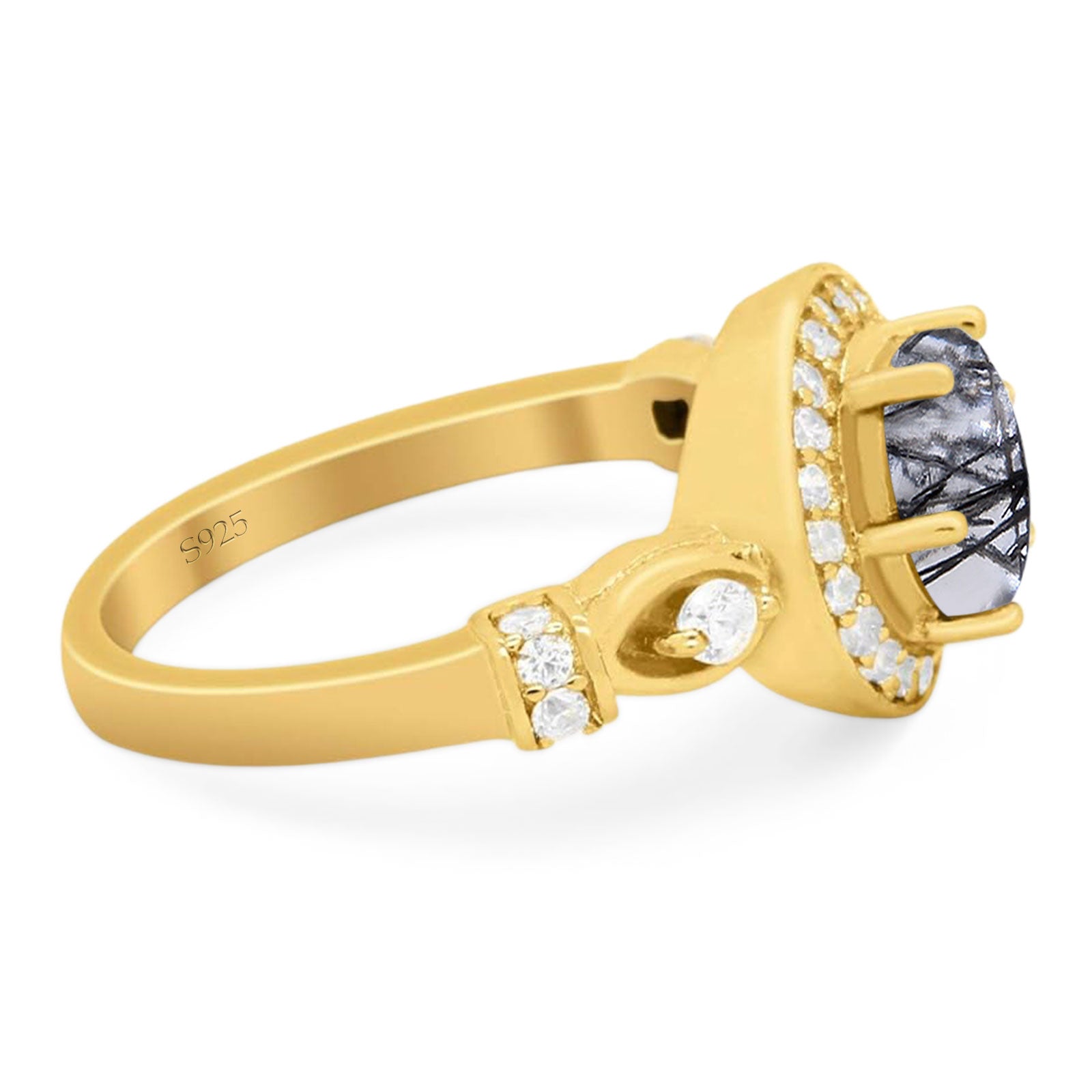 Vintage Style Round Natural Rutilated Quartz Halo Wedding Ring 925 Sterling Silver