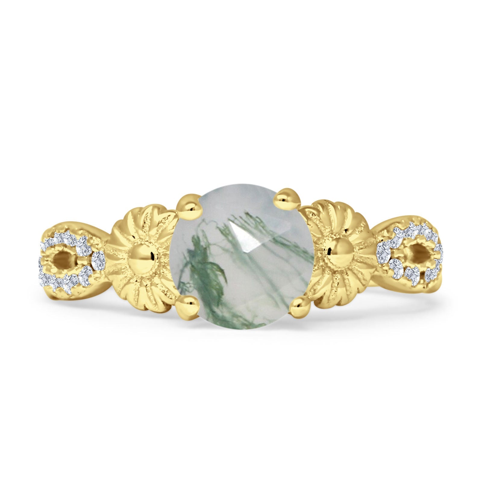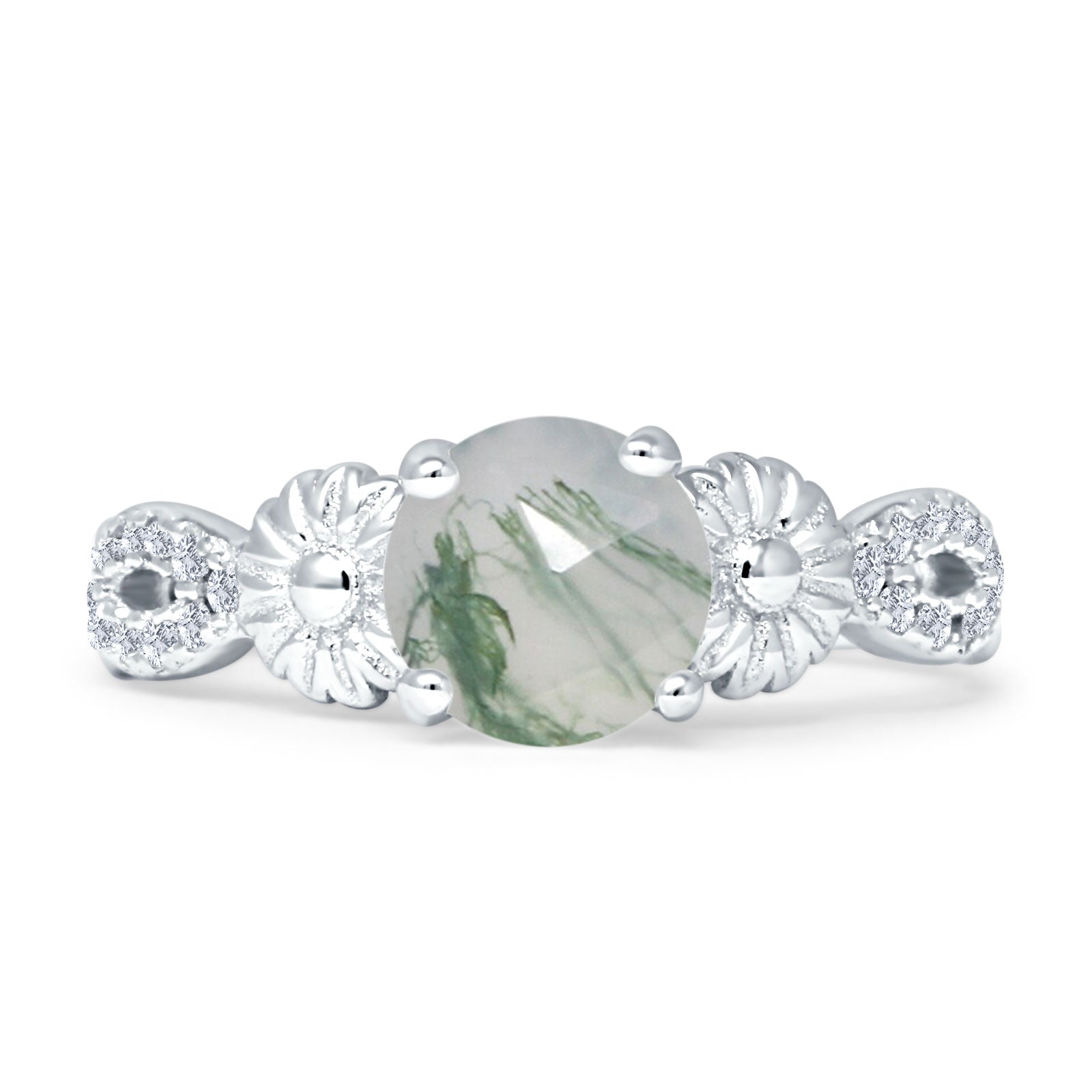 Vintage Style Sunflower Marquise Round Natural Green Moss Agate Ring 925 Sterling Silver