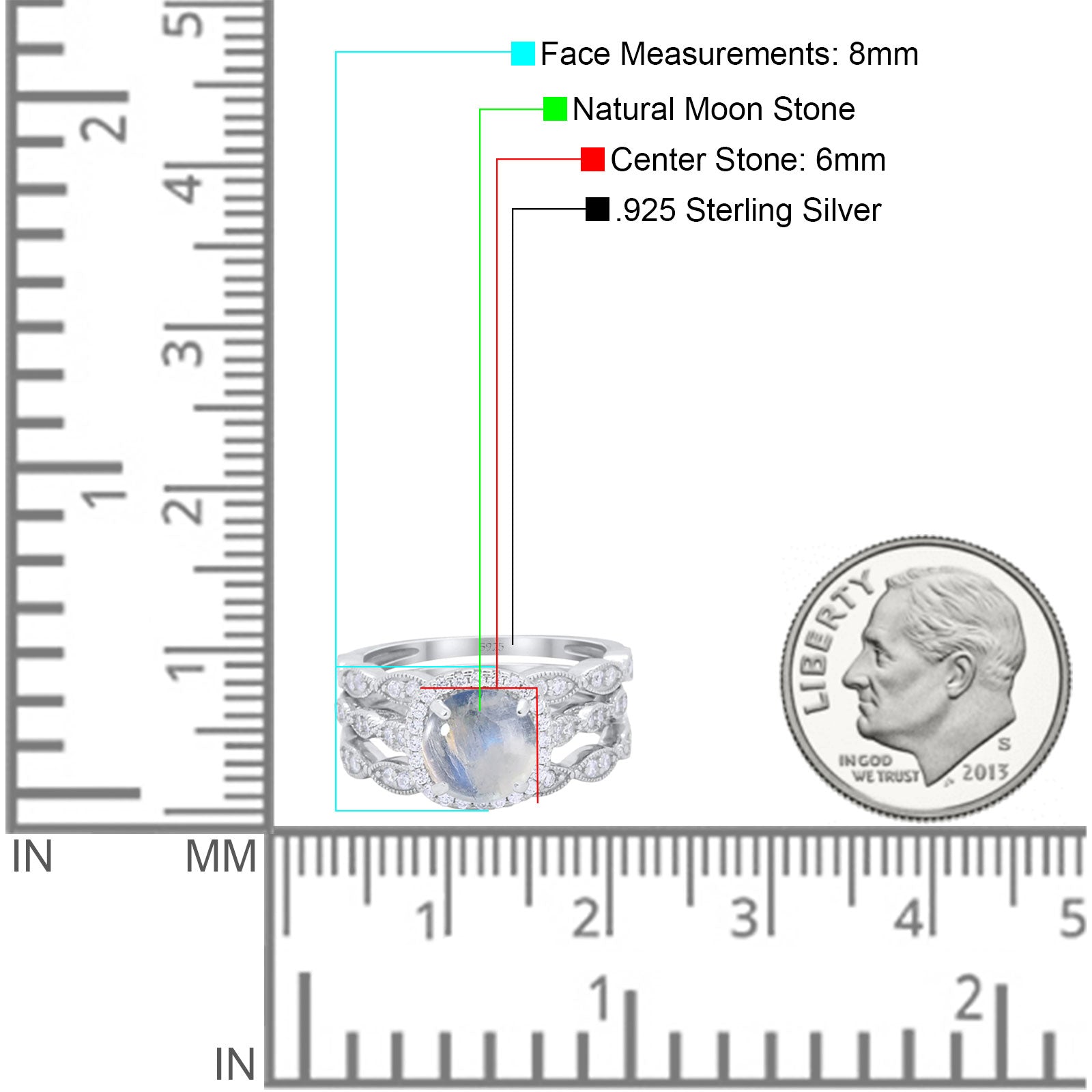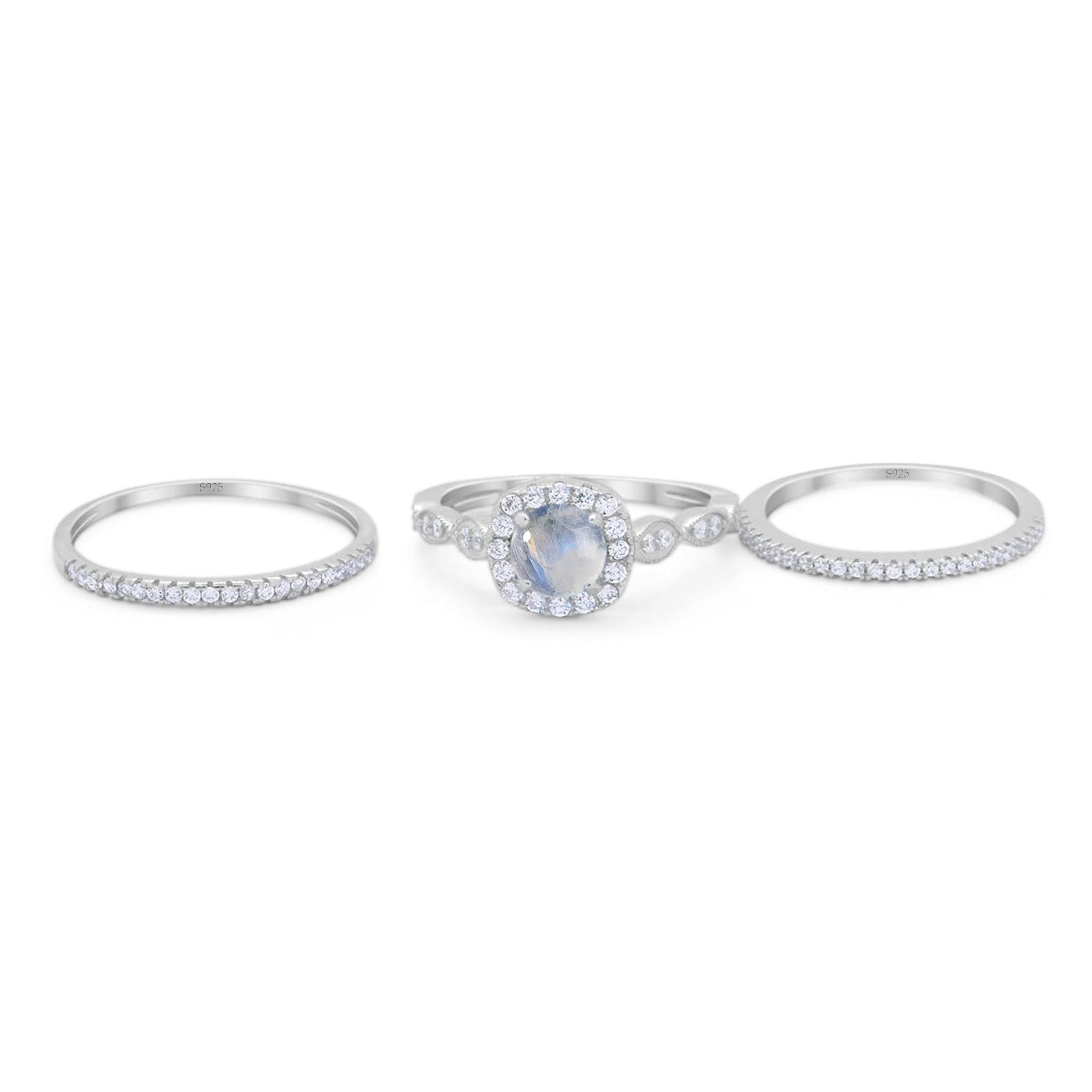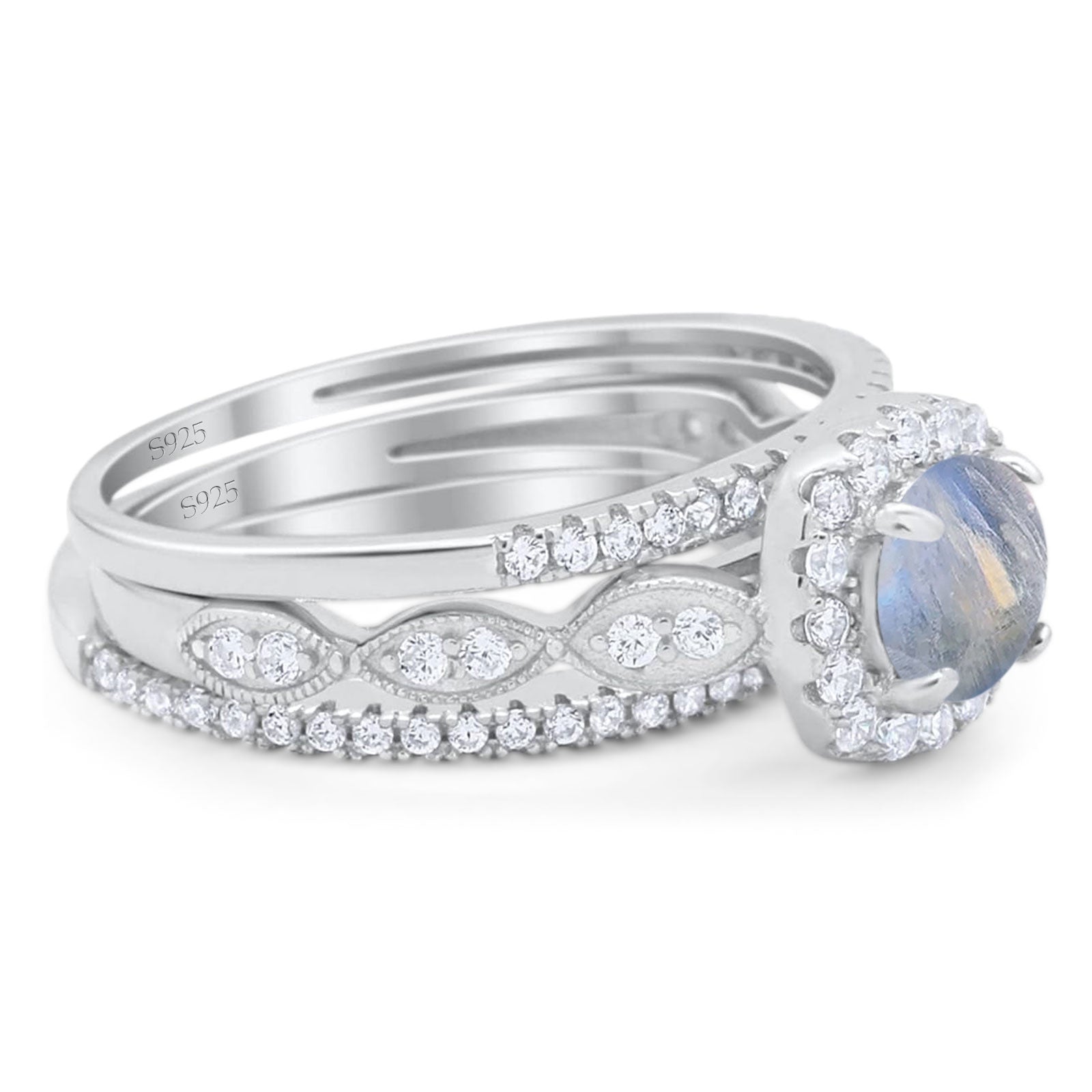 Vintage Style Three Piece Round Natural Moonstone Bridal Ring 925 Sterling Silver